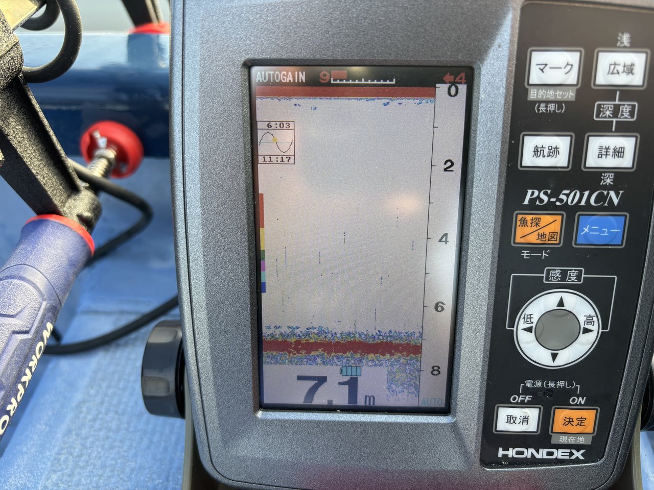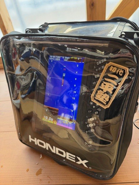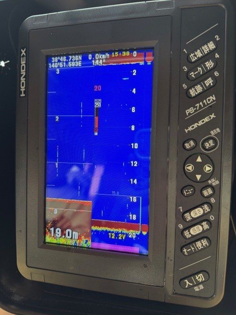 開始早々釣れてきますが魚探の反応はイマイチ。