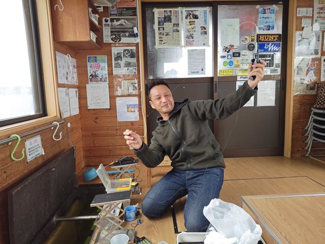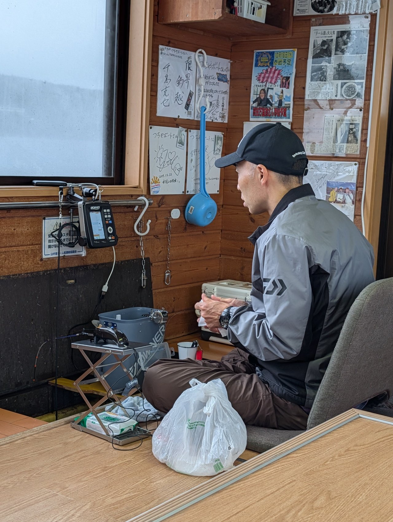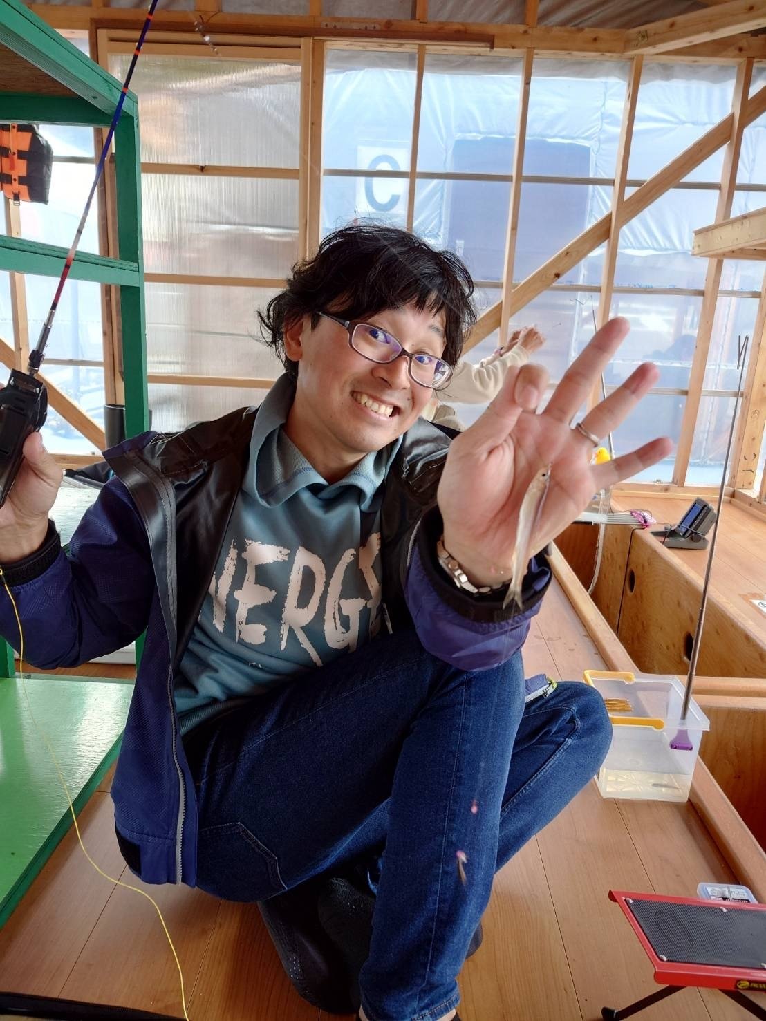一旦トイレ休憩で上に戻った際に、別のポイントで誘い方や狙う棚などを丁寧に教えていただき、その後の釣果を伸ばすことが出来ました。同行のボートワカサギ経験者の當眞さんには全然届きませんでしたが、今度は100匹超えにと燃えています。