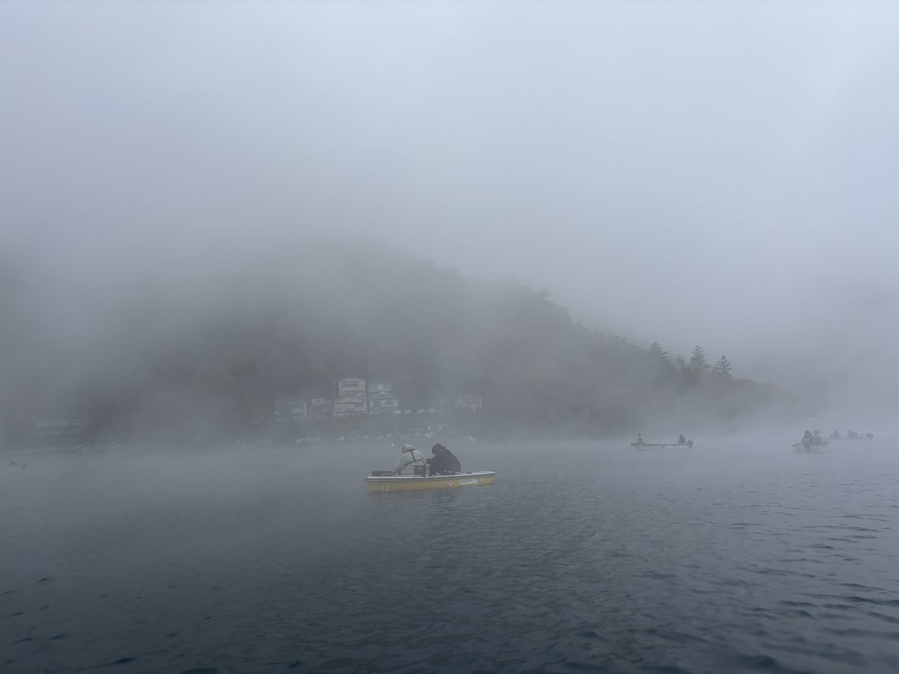 最低気温3.8度、最高気温5.9度と極寒でした、朝は濃霧でポイントのブイも見えず感を頼りに魚群探しの状態。