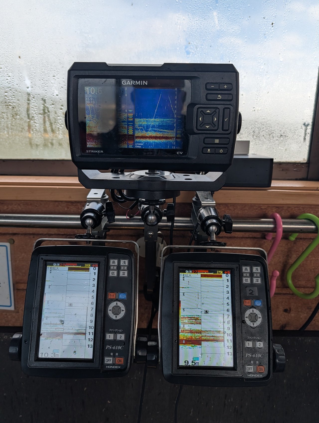 最初に聞いていたポイントでは、魚探に反応はあるもののなかなか食いついてくれず。