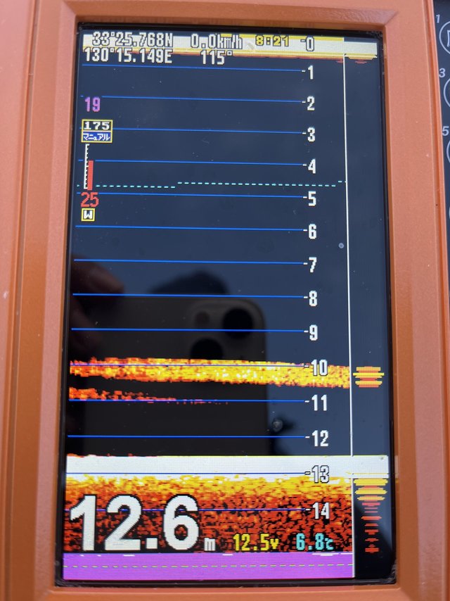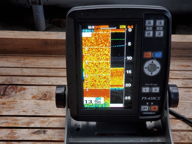 魚探には7m位から底までの反応、ですが中層の反応はなかなかサワリなく釣れてもマイクロサイズでしたので底中心に釣っていきます。