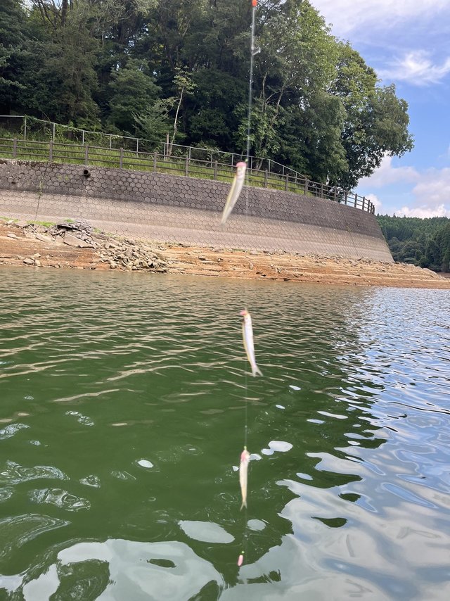 9月になりいよいよ気になる季節となりましたので佐賀県三瀬村にある全国屈指のワカサギフィールド「北山湖・北山ダム」に調査釣行しました。まずは半年ぶりのワカサギ釣りで状況が全く掴めていないのでボート桟橋近くのエリアを魚探で探ってみる事に!水深7~8mにワカサギの群れらしき影があるものの全く口を使ってくれず【異常なし】そこで夏の間順調に釣れ続けている【本湖6番ワンド】に移動。ここはワンド奥にある土管から冷たい水が流れ込んでいる所で他のエリアより活性高し!一投目の仕掛け着底後!即穂先が動く!久しぶりにワカサギのアタリはたまりません(^^♪その後も順調に釣れ続けあっとゆう間に300匹越え。陽が高くなる10時を回った頃からは流石に渋くなりペースダウンしましたが粘っていると時折分厚い群れが入り再度入れ食いに!気が付けば10束が見えて来たのでラストスパート!何とか納竿時間ギリギリで初戦を1000匹達成で飾りました。にしてもワカサギ=冬の考えは間違えですね!まさかツクツクボウシの鳴き声をBGMにワカサギ釣りをするなんて!これから徐々に水温が下がると更に活性が上がりボート桟橋近くでも釣れる時期となりますので今年も爆釣の予感です!