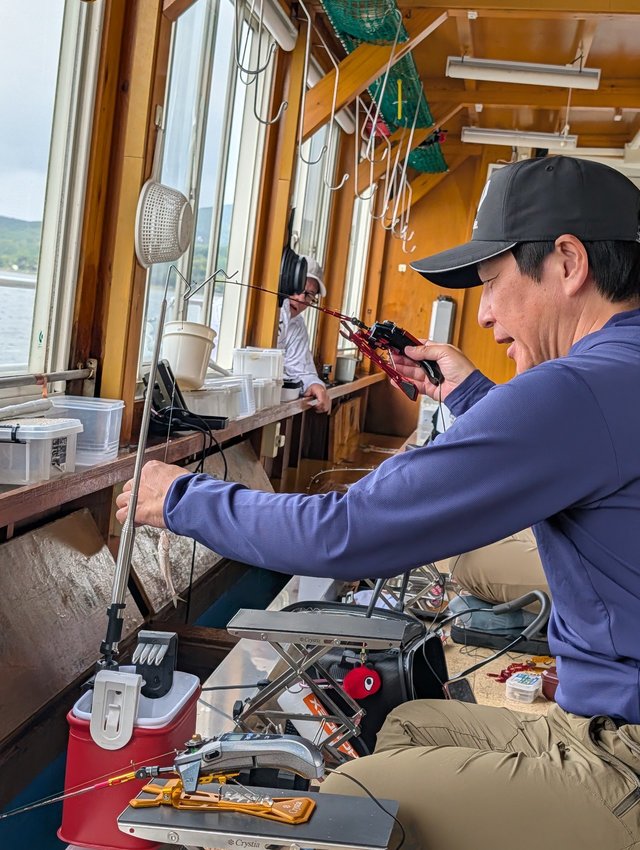 更に追加を狙いますが反応はなく、せっかくのFRP40馬力のボート借りていたので大きく移動、広くエリアをまわりましたが途中でワカサギを楽しんだもののジギングでのトラウトは追加出来ませんでした。