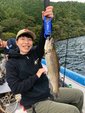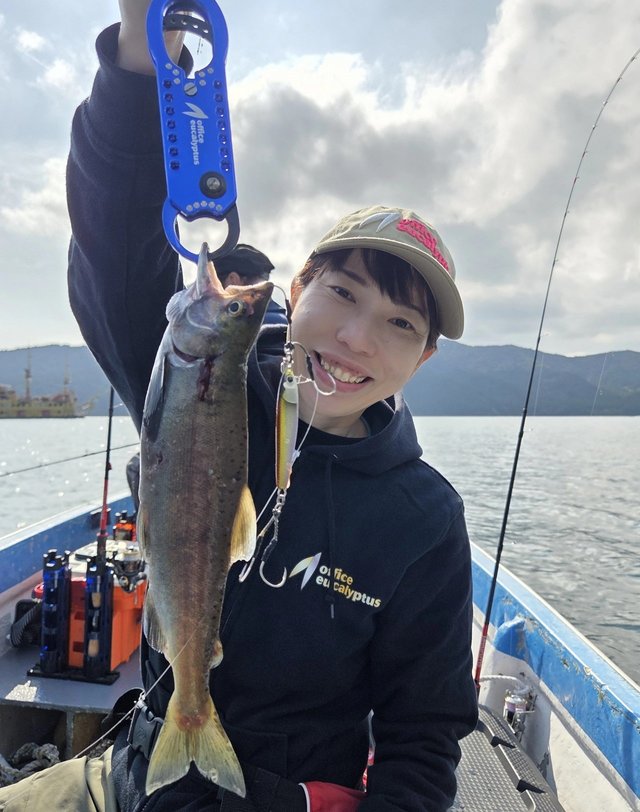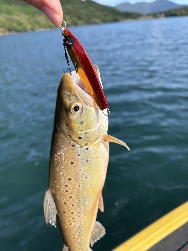 ボート屋さんに良さげなポイントを教えてもらってレイクジギングからスタート♪魚探で水深を確認しながら思い思いのジグとシャクリスピードで探るも生命感を感じず…お喋りに花が咲くばかり(笑)余りにも魚からの反応が無いのでジグをボトムにリフト&フォールさせるだけでダラっとお喋りしてると突然ゴツゴツっとアタリ竿が絞り込まれ一気に緊張感が走り無事にランディングした魚は綺麗なブラウントラウトでした♪