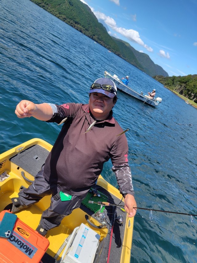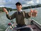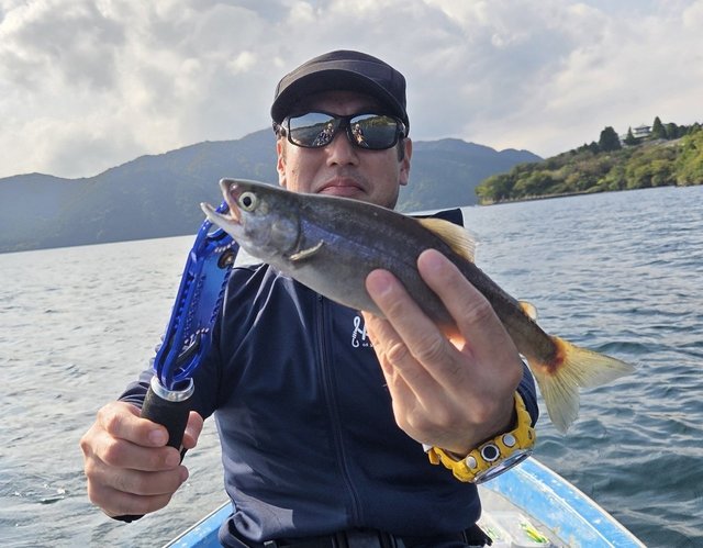 2年前にビギナーズラックで釣れたトラウト以来ぶりの芦ノ湖ネイティブトラウトは嬉しさ倍増でした。その後余韻に浸りながら追加を狙うも不発。途中ワカサギ釣りも楽しみつつお昼休憩をしにボート屋さんに戻りランチを楽しんで午後の部へ。午後はボート屋さんで教えてもらったヒメマスが釣れそうなポイントへ向かい実釣開始!程なくして黒葛原さんにアタリがあり一気に集中力が上がり、ついに!黒葛原さんが待望のヒメマスを釣り上げました!ヒメマスを生で見るのは初めてで魚体の綺麗さに惚れ惚れしました。釣れた水深に何度もボートを付け直しシャクリ続けると、ついに!私にもヒメマスが釣れました!このヒメマスを釣りたくてレイクジギングを続けてたと言っても過言ではない程釣りたかった念願の魚を手にした時の喜びはひとしおです。時合いだったのか友人の船長にもヒメマス、もう一人の友人もヒメマス、黒葛原さんにヒメマスの追加と全員安打でヒメマスを釣り上げることができ船上は大盛り上がりでした。気づいたら帰着時間間近だったのでお土産用のワカサギも釣ろうと1時間程ワカサギ釣りを楽しんでオツマミ程度のワカサギが釣れた所で終了時間となり大満足な釣行は終了。釣ったヒメマスはムニエルにして食べてみました。臭みが全く無く旨味があり噂通り凄い美味しかったです♪