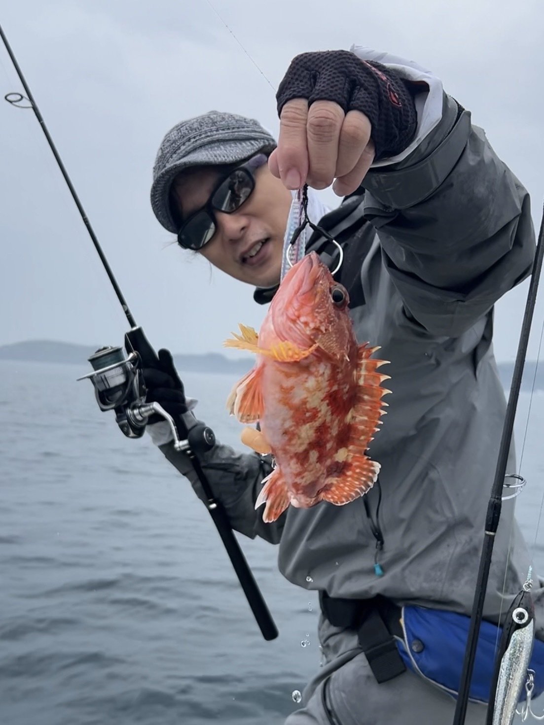 隣のスタッフがメタルジグをボトムを取ってからゆっくり巻いて根魚を連発していたので、私もゼスタのスロービー60gを付けゆっくり巻いているとコツコツ・・・ゴンっとヒット!!