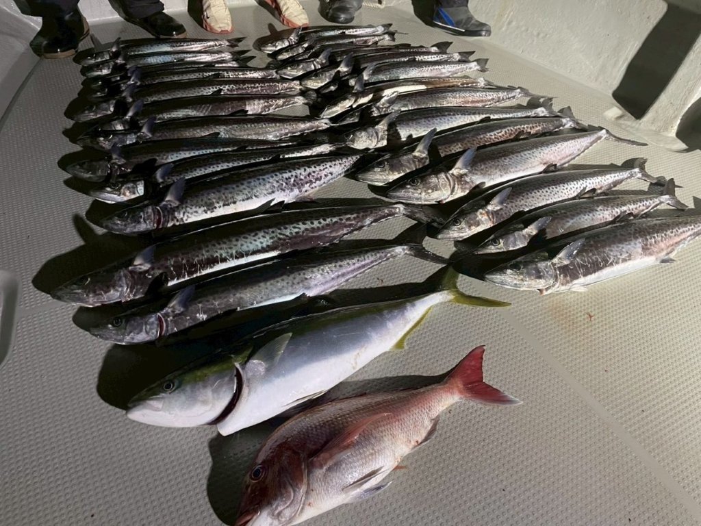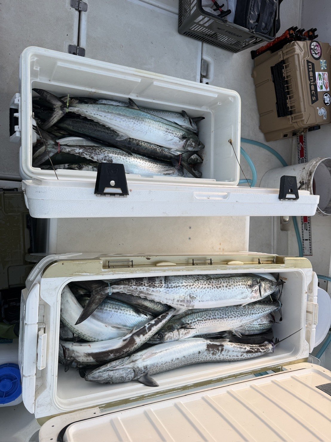 結果的に杞憂に終わり、船長の見切りの速さと機転のおかげで大きくポイントを変えた先で良型サワラサイズの群れにアタリ、船中19本!しかも全てサワラサイズ!