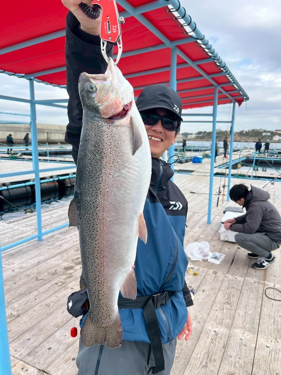 その後は生け簀の中が落ち着いてしまったので生け簀の外に浮気してラッキーなことに脱走マダイを2匹GET!ふらっと戻ってきて先ほどまでしつこく狙っていたみらいサーモンの周りにジグヘッドキビナゴを落とすと1匹が追っかけて行ってフォールが止まり...すかさず合わせるとHIT!無事「みらいサーモン」もGETできました。