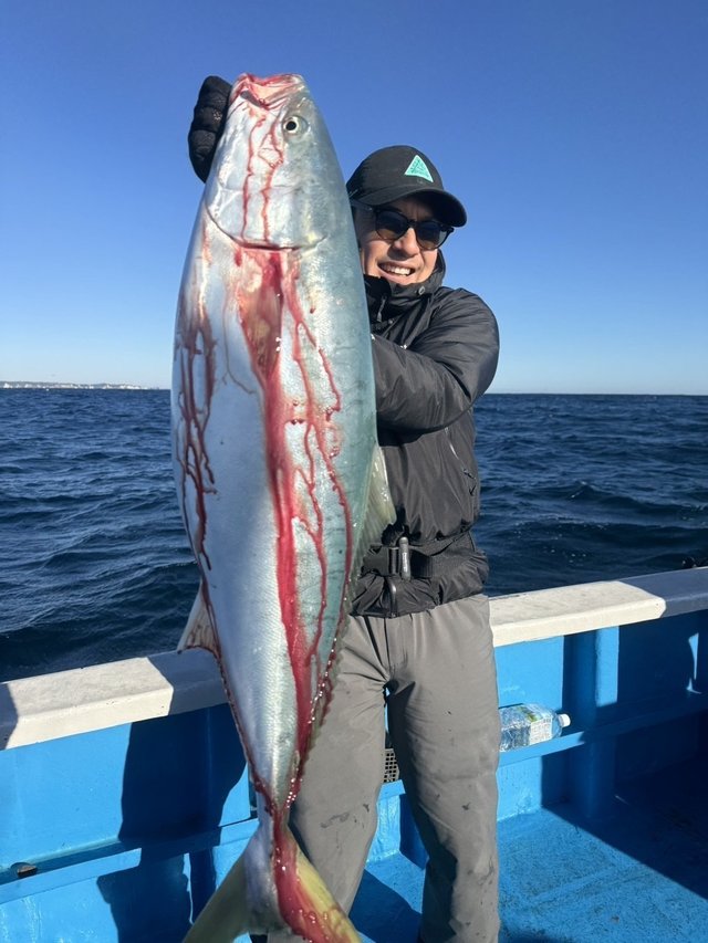 走水のビシアジへ行ってきました。船宿はいつもお世話なっている関義丸さんです。今回も仲間6人での仕立てです。沖に出てすぐに泳がせ釣りができるように出船前にサビキ釣りするのが恒例なのですがコマセを撒いても魚が全く寄らず不発でした。連日アジが厳しい状況と聞いてたのですが、前回のような厳しさはなくコンスタントに釣れ上がります。しかし25cmほどの中型主体で35cmを超える大型はなかなか釣れてくれません。しかし開始早々に釣れたアジを投入し底立ちを取ると直ぐに暴れだし青物が食いつきました!PE8号ハリス16号なので電動のパワーで一気に巻き上げます。無事タモに収まったのは7.9kgのブリ、一投目の着喰いは初めての経験でした。その後仲間に7.8kg、さらに私も5.8キロを追加し泳がせは大満足の結果となりました。アジはあまりぱっとせず最終的に23匹の釣果でしたが、家に帰ってブリを捌くと胃袋に私のアジとは別物の新鮮なアジが入ってたのでプラス1匹かな(笑)