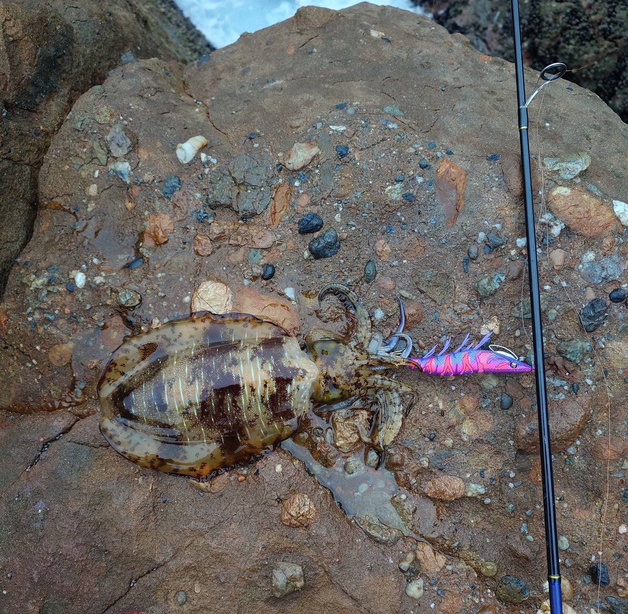 天草店の田口です。下田方面でアオリイカが結構釣れていると耳にしたので短時間勝負でやってみました。地磯での釣行だったので沈み瀬周りを探っていたら300g程のアオリイカが2杯連続で釣れました。ランガンしたらまだ釣れたと思いましたが時間が無く、終了しました。