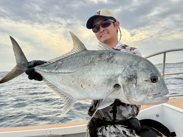 前日に引き続き2月らしい厳しめのコンディションでしたが、ラストポイントにて無事GTキャッチ。ダブルヒットでしたが、私の魚は5Kg。可愛いサイズでした。が、背中にタコ掛かりして滅茶重い。水深も浅く、地獄の2分間でした。