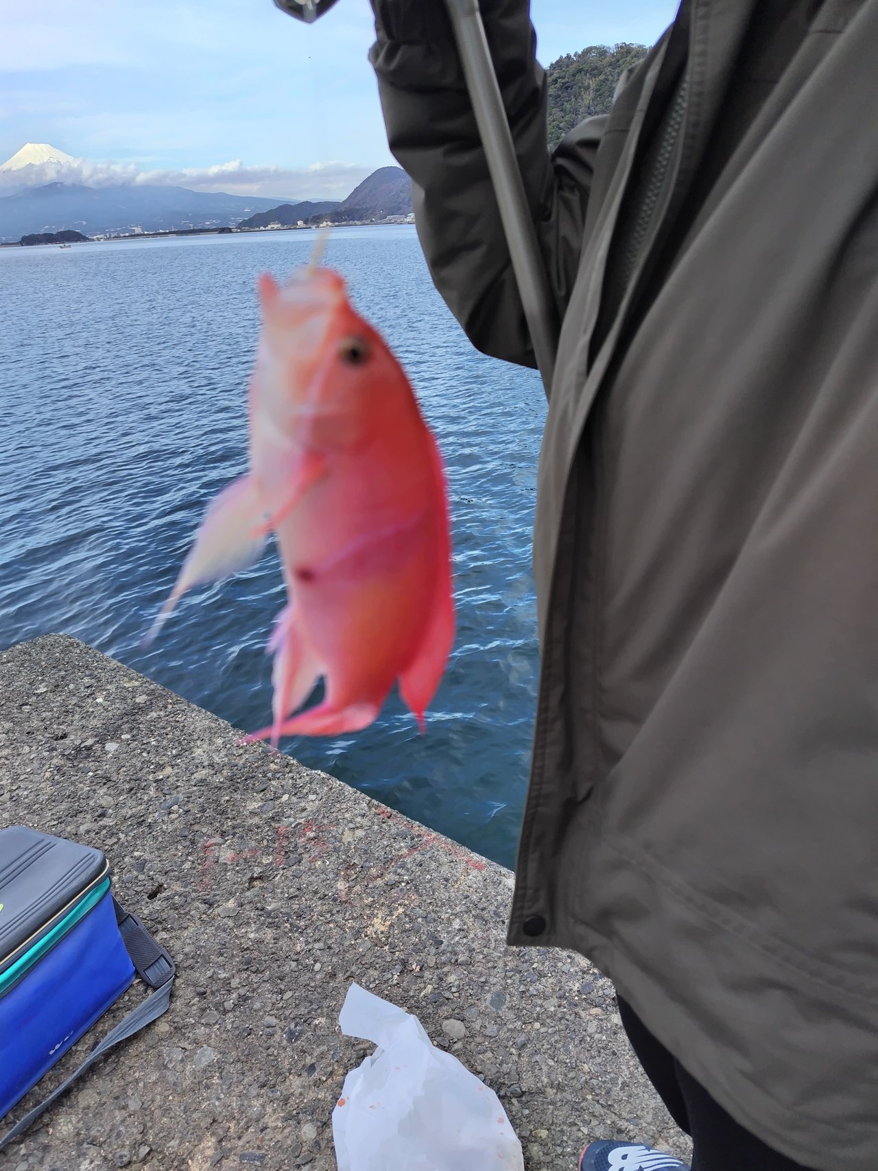 翌日もフカセ釣りをしました。この日は足保港まで行って、入り口管理事務所にてオキアミ購入し、駐車代金も払って足保にて釣り開始。しかしコマセを巻いても針に掛からない極小サイズの魚しか寄らず、ポイント移動して沼津方面に上がりました。