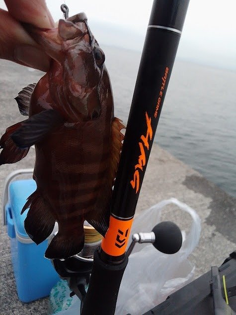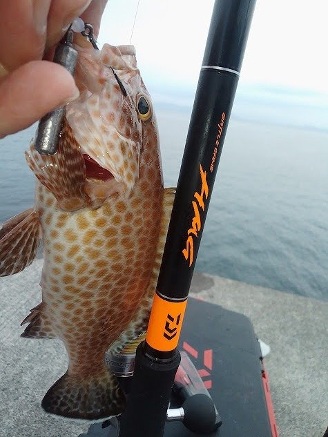 エサ取りの猛攻を避けるため、遠投での攻めにシフト。潮目の向こう側、ボトム付近を丁寧に探っていくと…『待望の大型根魚!!』…とはいきませんでしたが、オオモンハタやヤミハタが次々と果敢にバイト!特にオオモンハタは30cm前後のサイズが多く、引きも強くて楽しませてくれました。結果、9匹をキャッチ。短時間ながら満足のいく釣果となりました。