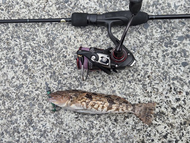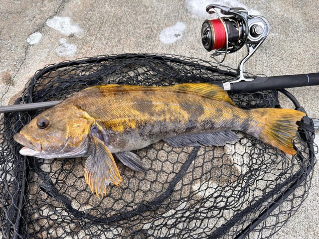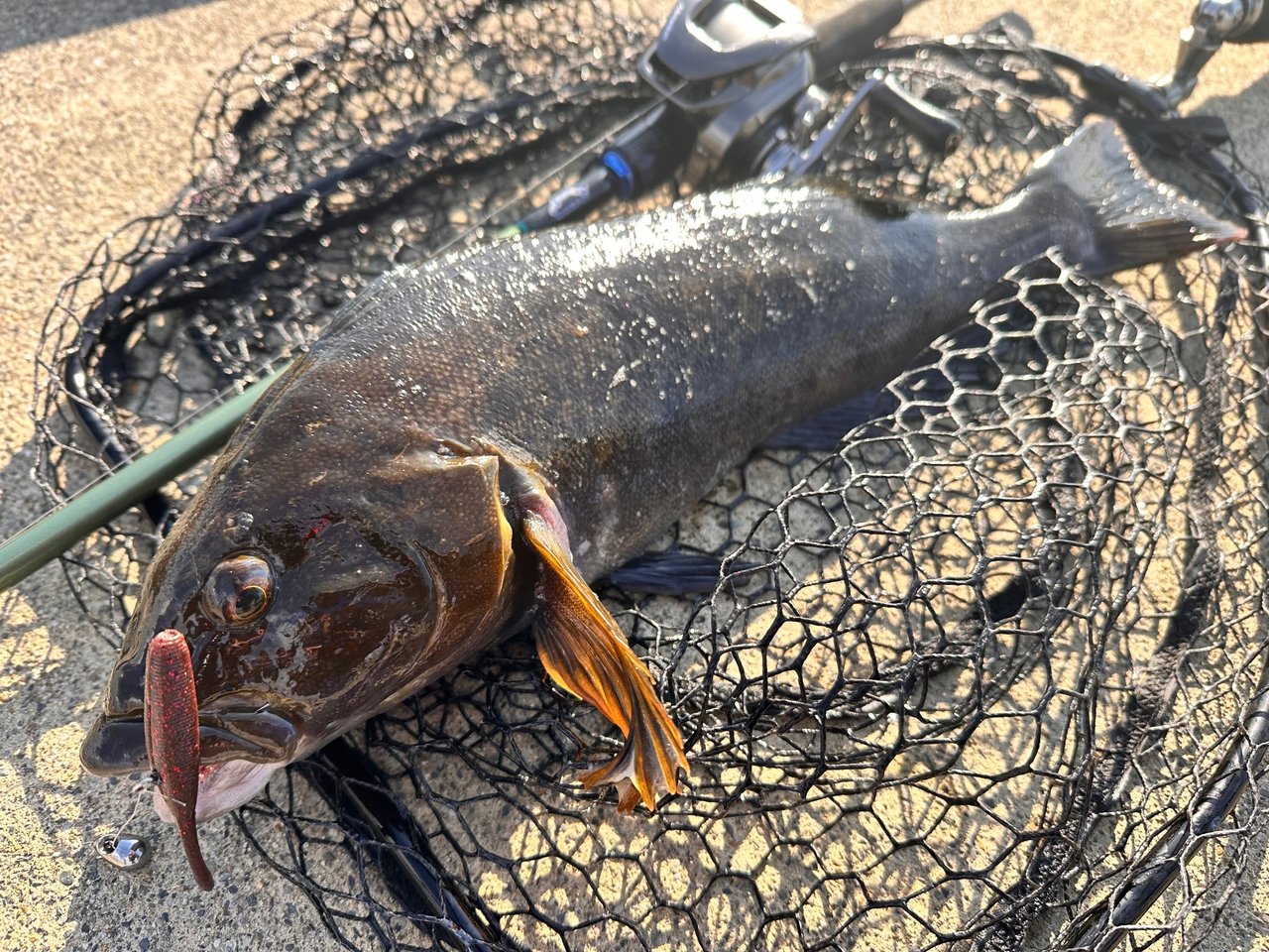 2026年一発目はやっぱりこの釣りッ!ロックフィッシュ!とりあえず、40upを目標に遠投で広範囲を丁寧に探るも約2時間程、ノーバイト、、、。際にでもいるのかな~何て、『ドライブスティック3”+ビーンズTG42g』を回収して、足元で強いダートアクションを入れると下から45upが突き上げバイト!!!フックには掛からず、またもアプローチするとまたもバイトしてくるも乗らず、、、。タックルを専用タックルに持ち替える!ワームは同様で『ビーンズTG10g』に変更し、際の魚に集中!