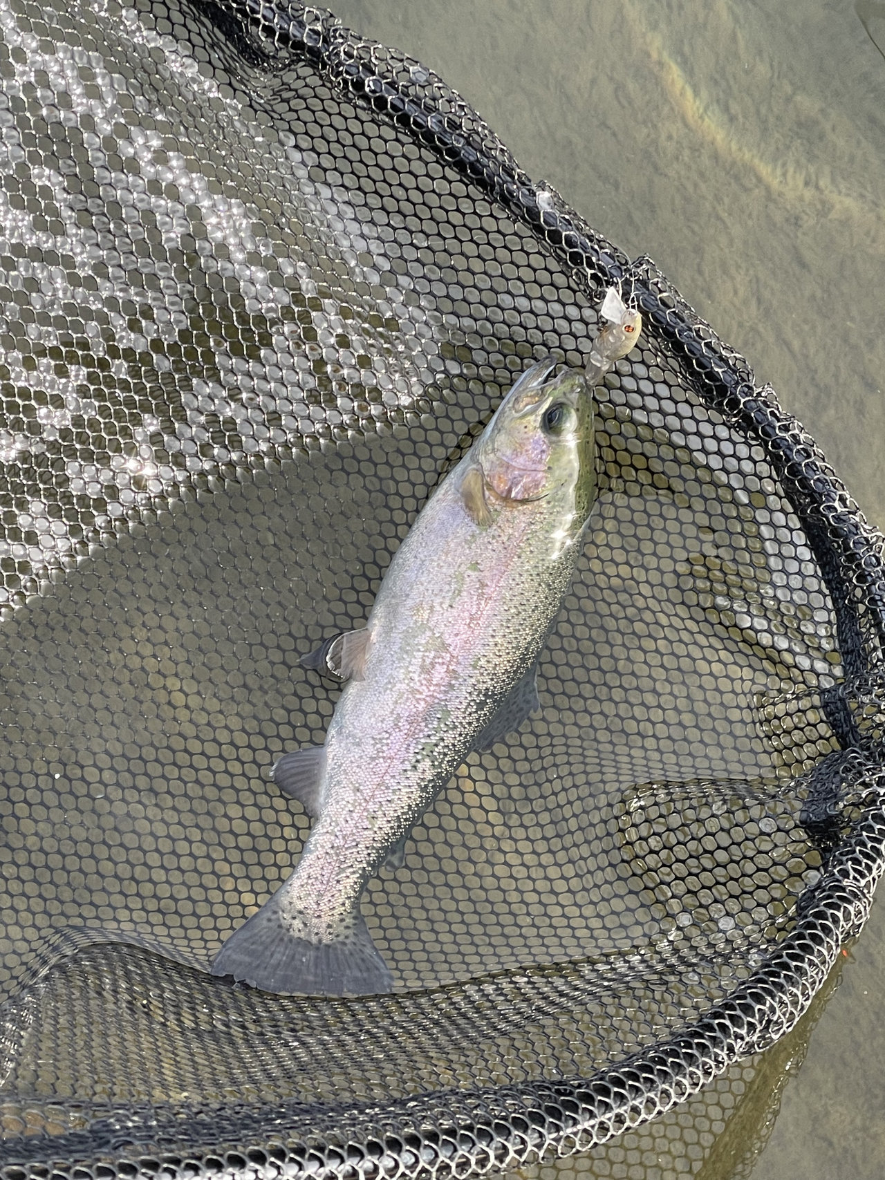 この日は風も弱く穏やかな日差しで日中はポカポカ陽気でした。9時にレストハウス前に複数人で入れそうなスペースを確保したので、実釣開始!スプーン・クランク・ミノーなどいろいろ試しましたが、結論ボトムしか勝たん状態でした。大きく動かしてステイさせるよりも、小さく絶え間なく動かして抑え込むアタリを取る方が有効のようでした。