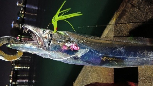 さて、この夜釣りのカマス釣りは電気ウキを使い、エサはキビナゴやサンマの切り身。