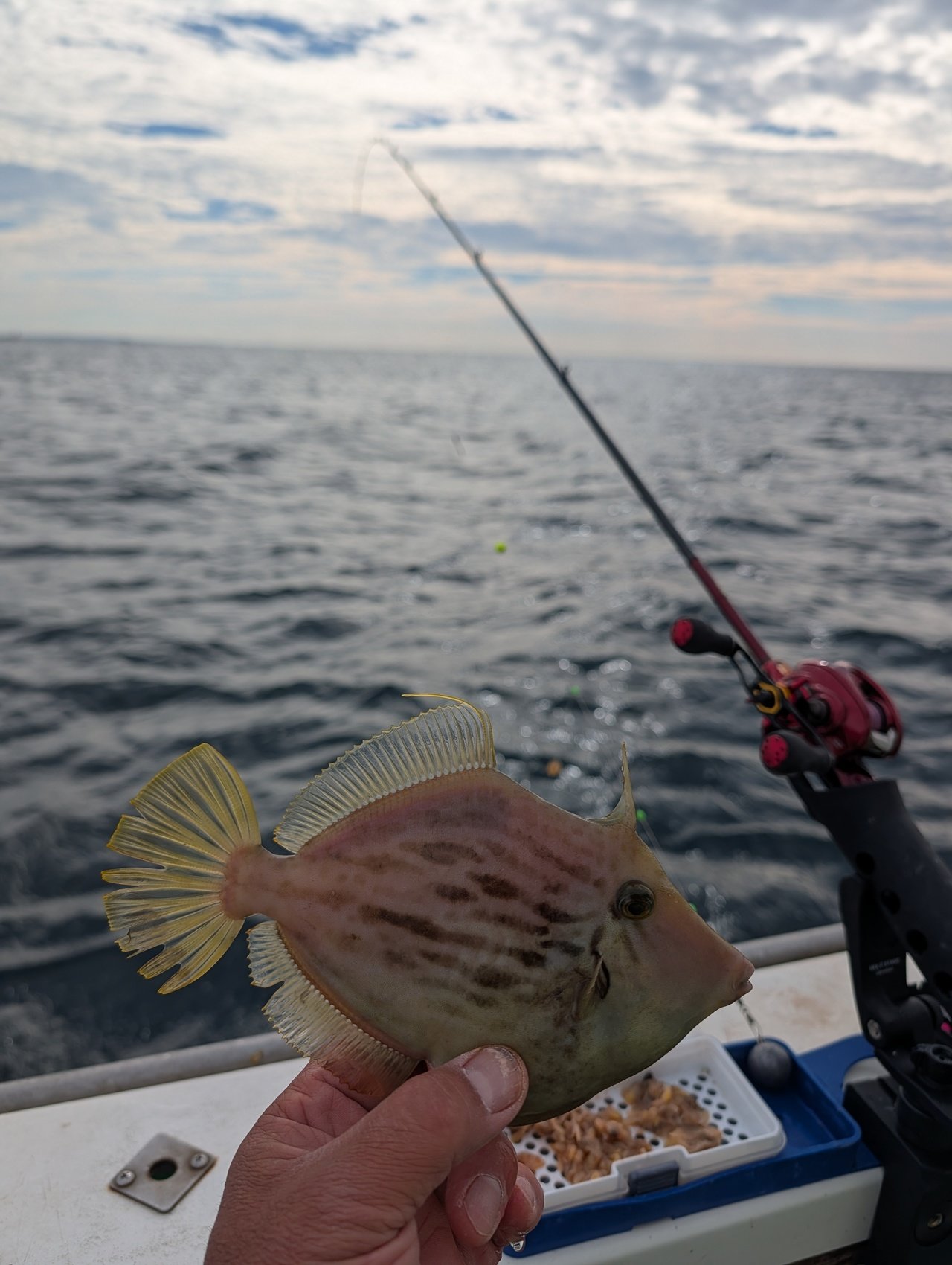 さぁ実釣です。YouTubeでは簡単そうに見えてた“アサリの装着”は私は結構手間取るものでした。しっかり底を取ったらちょんちょん。カワハギ特有の繊細なアタリを感じても掛けるのが難しかったです。