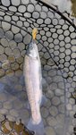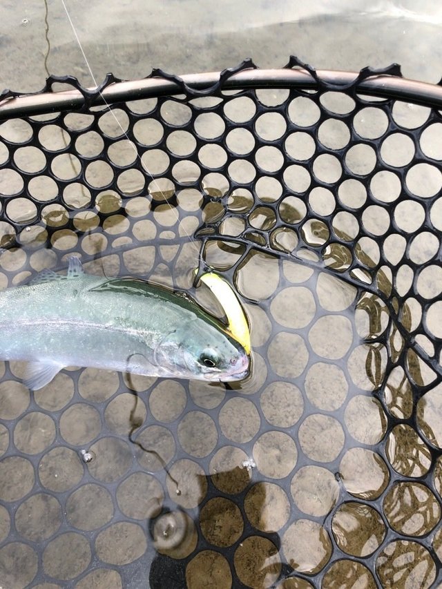 ドライフライは風で流されてしまい反応ゼロ。そこで沈めるパターンに切り替え、なんとか1匹キャッチ!強風で釣りにくい状況でしたが、工夫して得た1匹は格別でした。