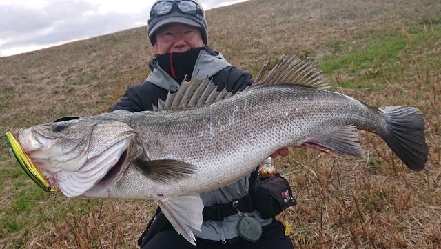バチの様子を見に行く途中に、お久しぶりのエリアへエントリー!準備をしていると、成田冨里店の佐藤と遭遇。風の噂ではかなり厳しくなったとの事でしたが、話を聞くとやはり厳しい様子・・・あまり期待をせずに釣りを開始すると、噂通りの生命感の無さ・・・寒空が広がり、寒風が身に染み始めた頃、ふわふわと力なく漂わせていたサスケ120裂波が突然引っ手繰られ、唸るドラグ!鈍重な引きに『鯉かな?』と緊張感のない一進一退のファイトを繰り返し、浮上した魚はシーバス!惜しくもファールフッキングとなってしまいましたが、風格ある魚が釣れてくれました。