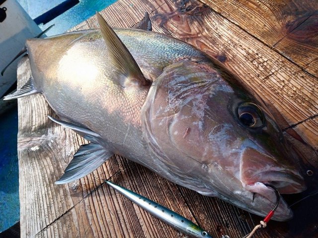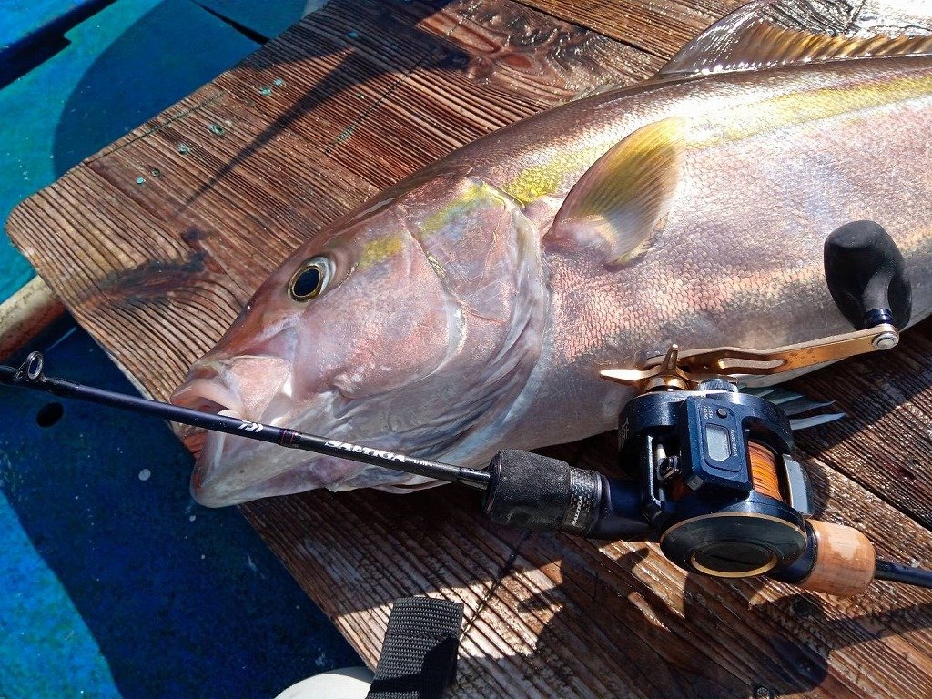 締め込んでいたドラグが引き出されながらも無事約90cm8キロのカンパチをGET!