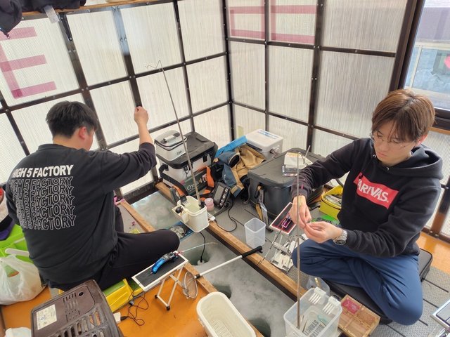 前日までの暖かさもあって入れるポイントも限られていましたが、小型ハウスに入って釣り(という名の宴)開始。