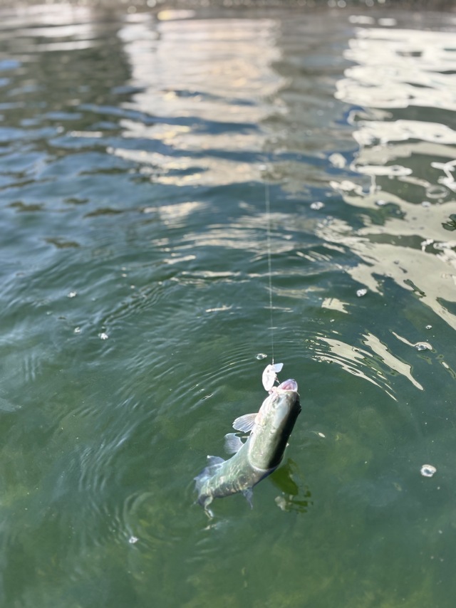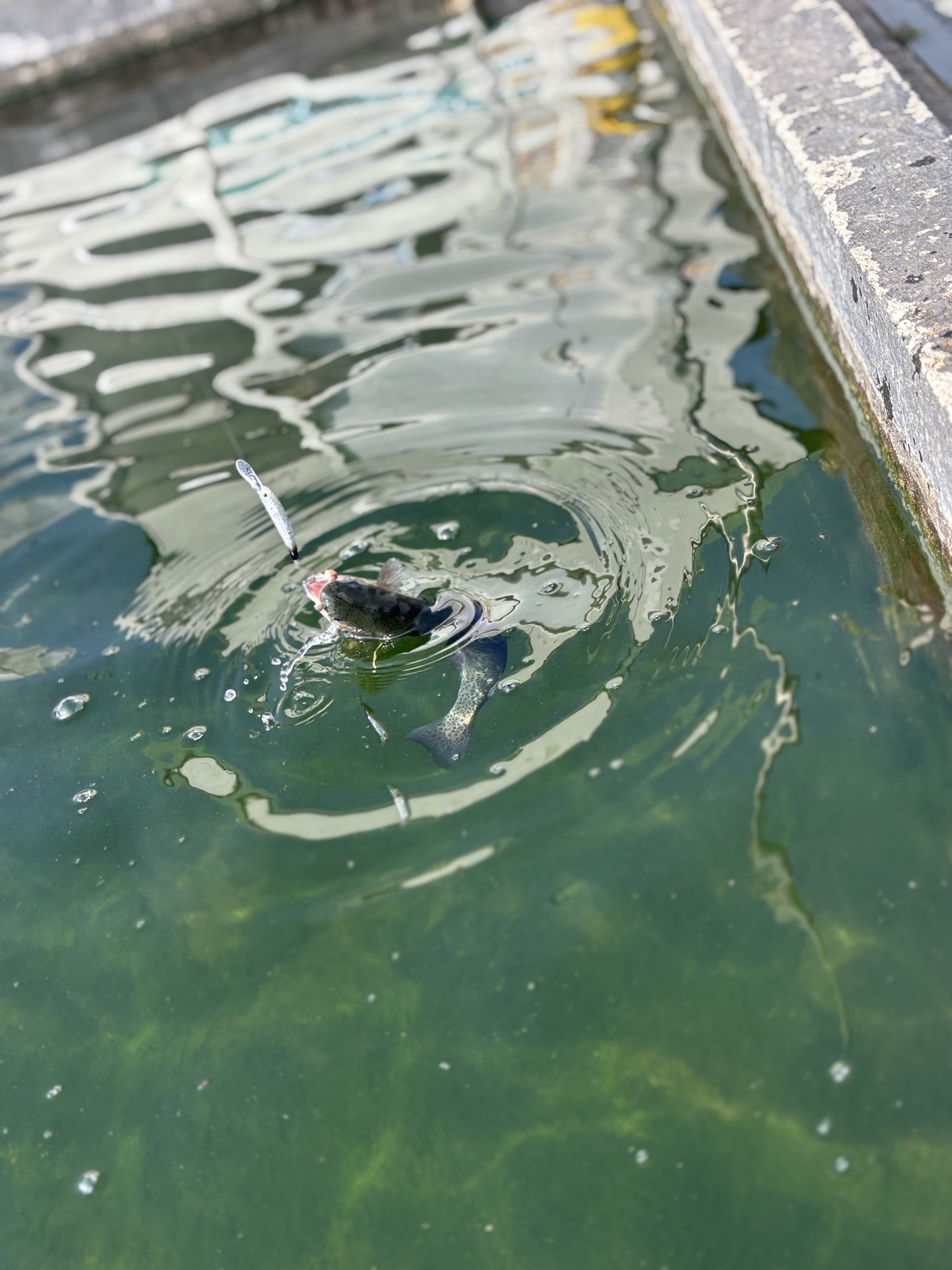 前回の反省から水深、流れのある所、シェードなどのオープン気味な場所を集中して釣り10匹以上釣る事が出来ました。養殖バスだからか、シャローカバーに入る際に葦、ガマなどを揺らす時がありかわいい。
