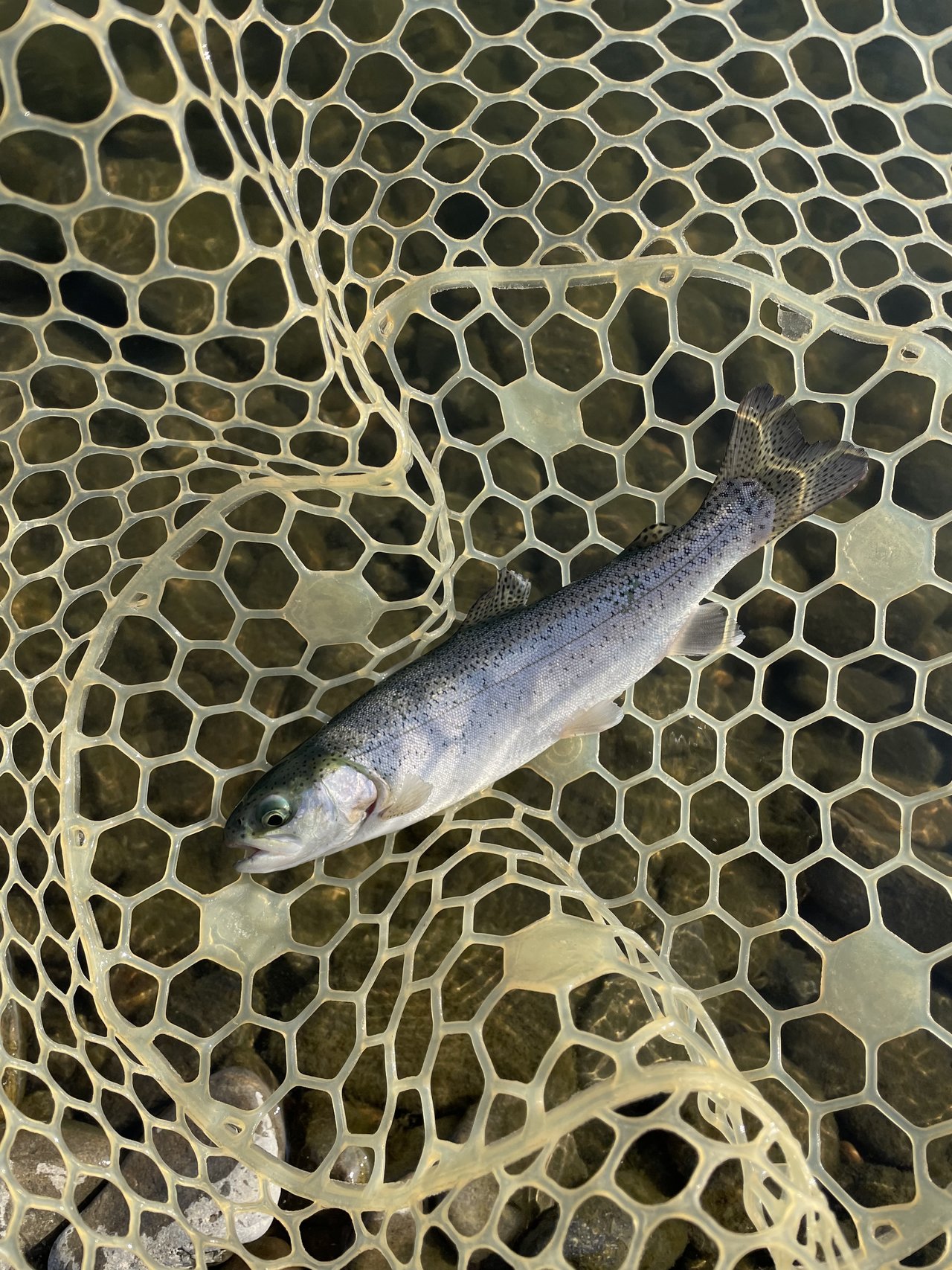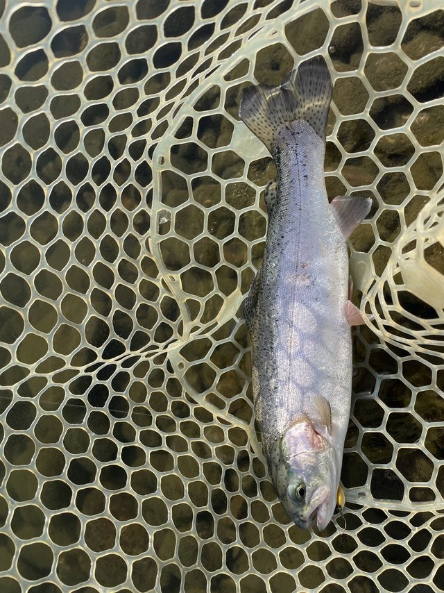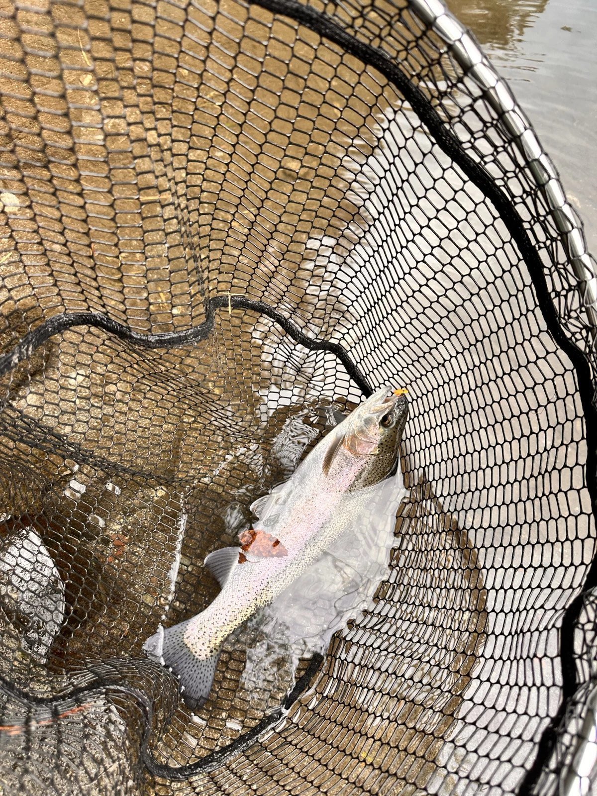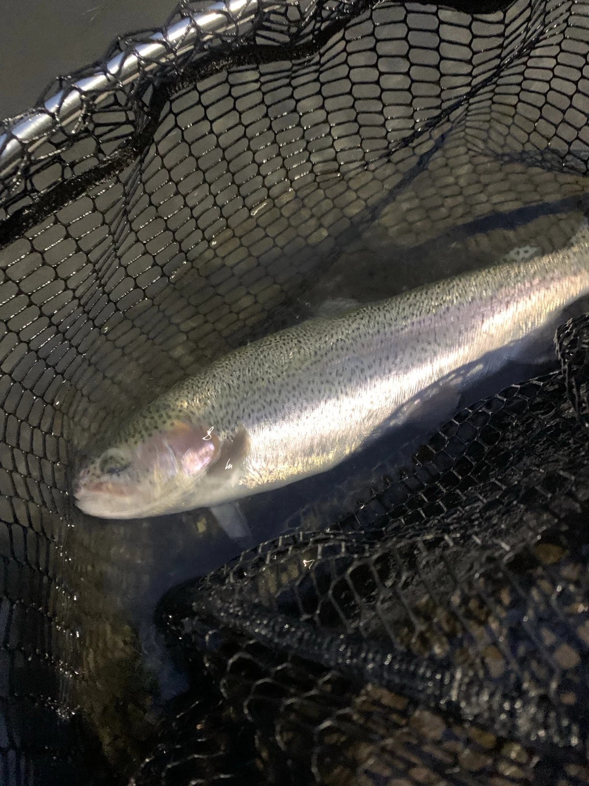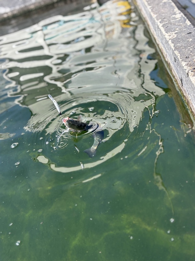 弁慶堀フィッシングクラブさんに行きました。都心のお堀で手漕ぎボートフィッシングでニジマス狙い。前評判では引きがかなり強いという事。先ずは久しぶりの手漕ぎボートだったので心配でしたが直ぐ慣れポイントを探し移動、雨が少ない為か水深は2m位ですが至る所の底にはウィードが多く底までスプーンを落として巻くと引っ掛かる事も多くでしたがウィードが無い所を探し同じ様に底までスプーン落とし巻き上げ来るとアタリが有り普通の管理釣り場の魚より引きは強くネットINまでのやり取り時間も掛かり楽しめました。