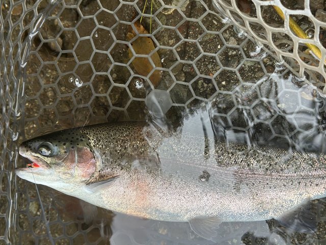 ドライフライは風で流されてしまい反応ゼロ。そこで沈めるパターンに切り替え、なんとか1匹キャッチ!強風で釣りにくい状況でしたが、工夫して得た1匹は格別でした。