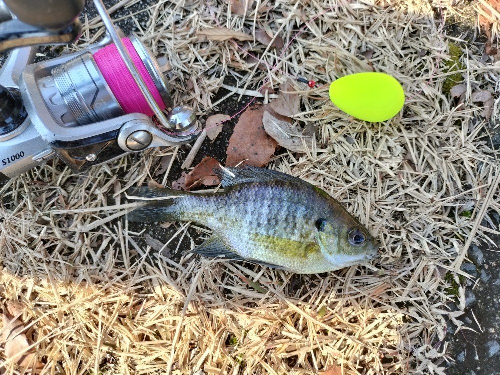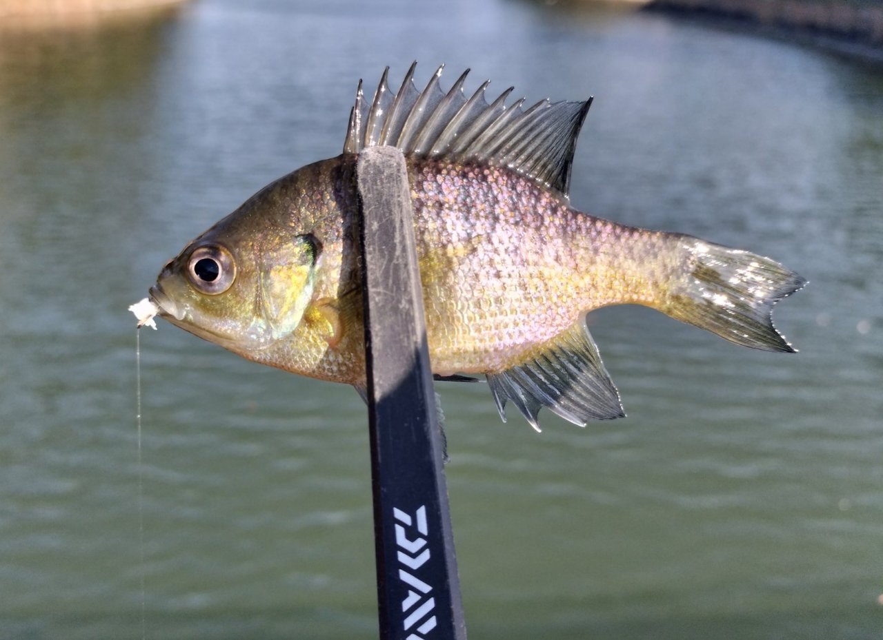 秋までは釣れていた魚達の姿はなく、確認できたのは魚種はブルーギルのみ。エサを落とせばピクピクしたアタリが常にあるのでワクワク感を忘れる事なく楽しめました。