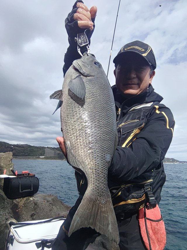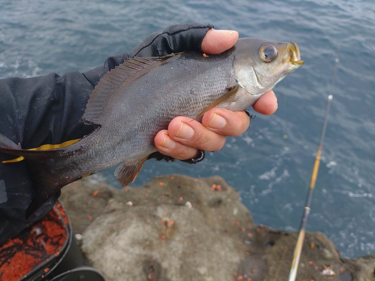 沖には潮のヨレが手前に出来たり、沖に出来たりと変化していきます。その潮のヨレを超遠投で一つ一つ潰して行きます。最初はコッパ尾長やイサキの連発でしたが投入位置やタイミングをズラしたり、時にはコマセを遠投して仕掛けと合わせたり試行錯誤を繰り返すとやっと30センチを少し超える尾長、更には43.4センチの口太もキャッチ!