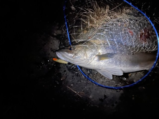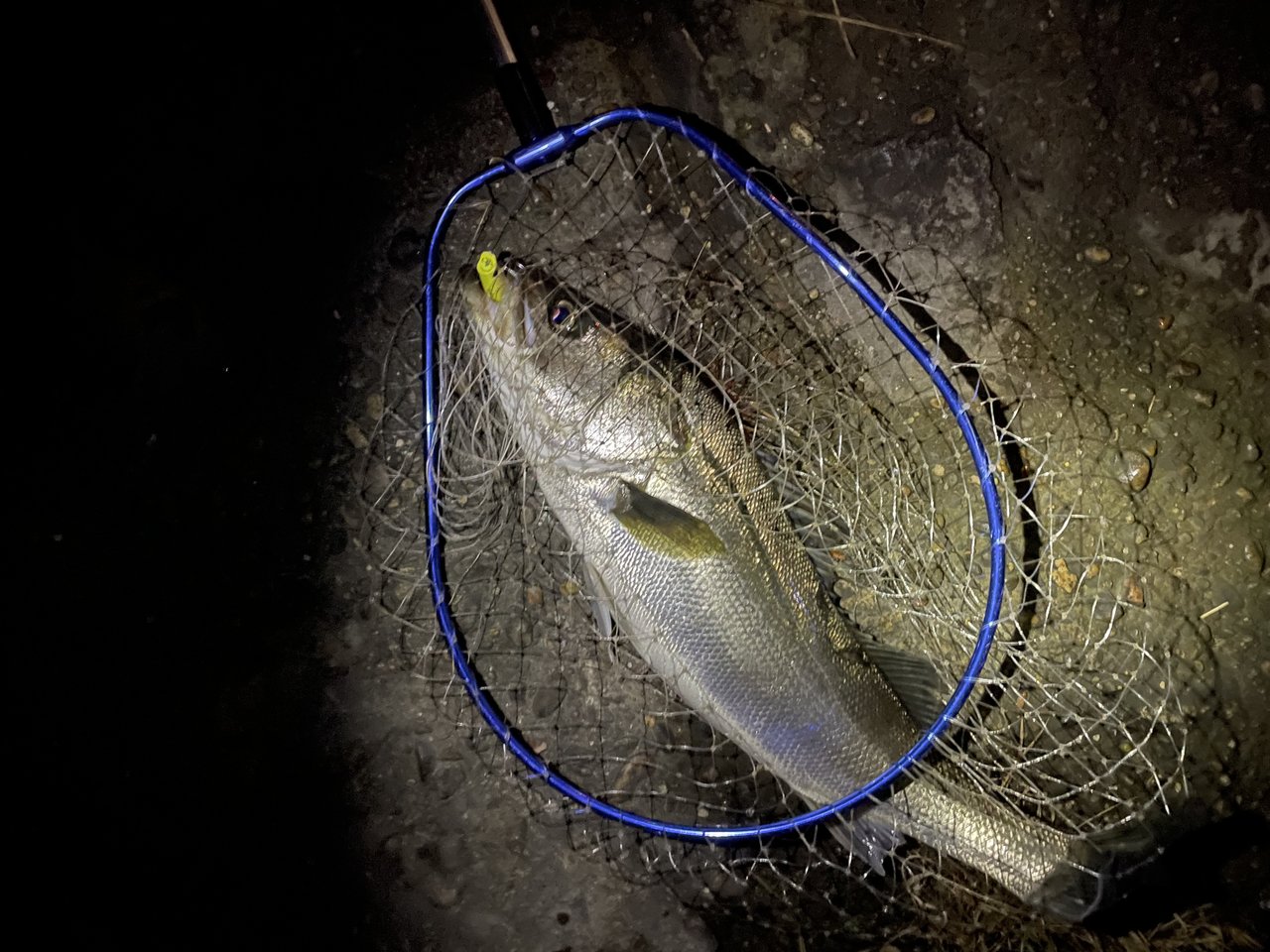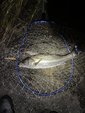 下げの時間を狙って23時からスタート。先行者は1名です。エンパシー90をキャスト何かコッとあたりベイトがいます。数投でヒット、エラ洗いが大きいです。上がってきたのは70アップ太いです。幸先よしです。その後一本追加した時にライントラブルがありリーダーを交換しようとポケットを見ると入ってません、ハイ車まで戻りです。25時に再スタート数投でヒット何か違います、近くまで来ると走りますやり取りして上がってきたのも70アップです。満足して終了です。