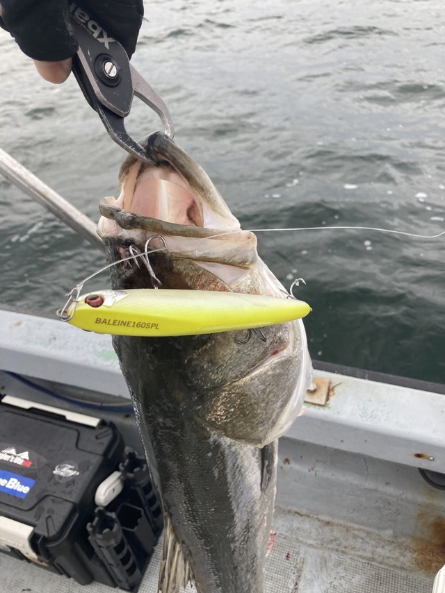 今シーズン初となるオルカビッグベイト便へ行ってきました。前日からの強風で出船時間変更して、乗船。散り散りになったベイトを探すところからスタート。今回はバレーヌ160SPLをメインに使う。渋い状況の中、ゴーストなどでチェイスは度々あるものの、ヒットはしない。ビッグバンデットのダートで釣果が出ていたので、バレーヌ160SPLをダートさせるとヒット。バレる。今日のヒットパターンがわかってきた頃、残り時間は1時間。IMZは400投を超える頃、ヒット。77センチ。早巻きのストップアンドゴーでした。