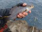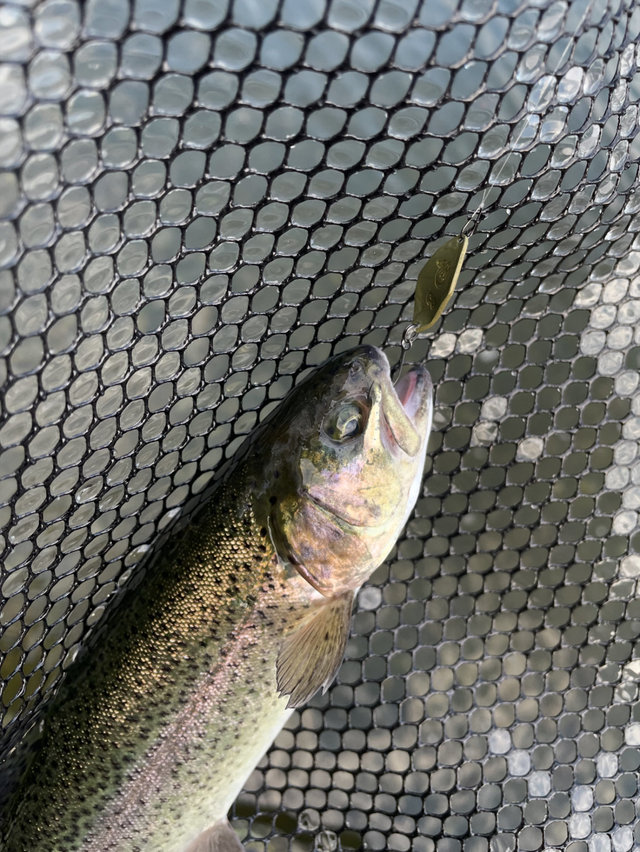 何と開始一投目で初トラウトの友人が記念すべき一匹目を釣りました!