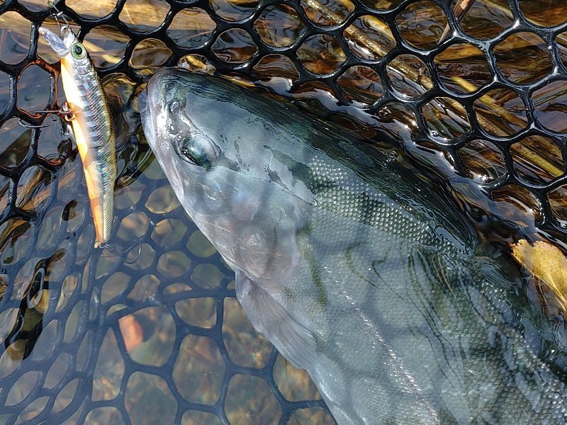 広範囲サーチでビーハート(旧ブレイブ)ネイティブ、浅瀬でパニッシュ70、水深や流れのある所でDDパニッシュ65といった感じでテンポよくキャッチ。その後、居残りの大型狙いにシフトしましたがこちらは空振り(笑)