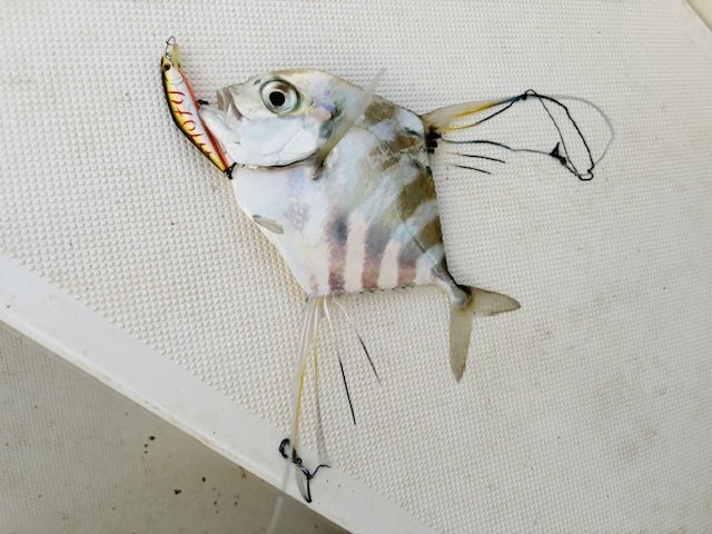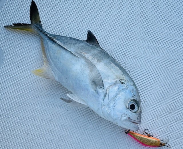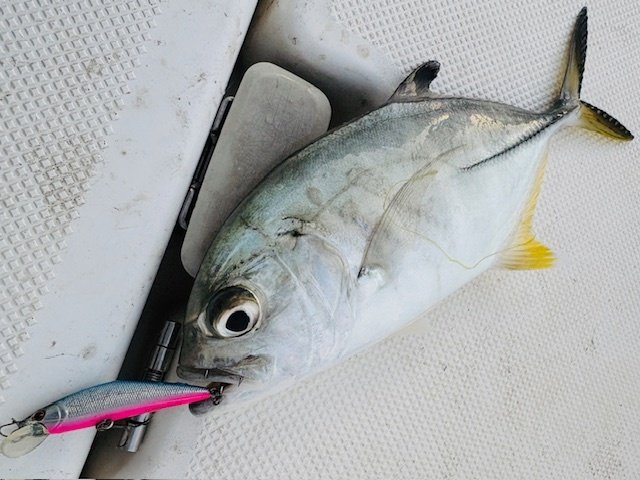 明るいうちはミノーやメタルジグを使ってメッキを狙います♪こちらは超高活性!!船の前まで果敢にルアーを追ってきます!サイトでも釣れて強い引きに大興奮♪その後もミノーをコロコロ変えて楽しみましたがメタルジグはイレグイ状態でしたよ~!