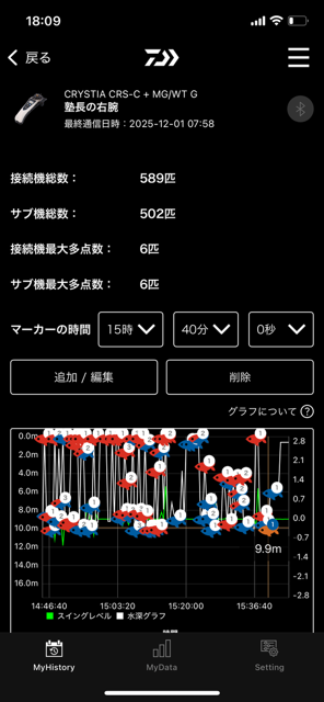 場所によっては魚探は真っ赤です!そっちか~と思いながらも懸命に誘ってエサをバンバン変えていると・・・。