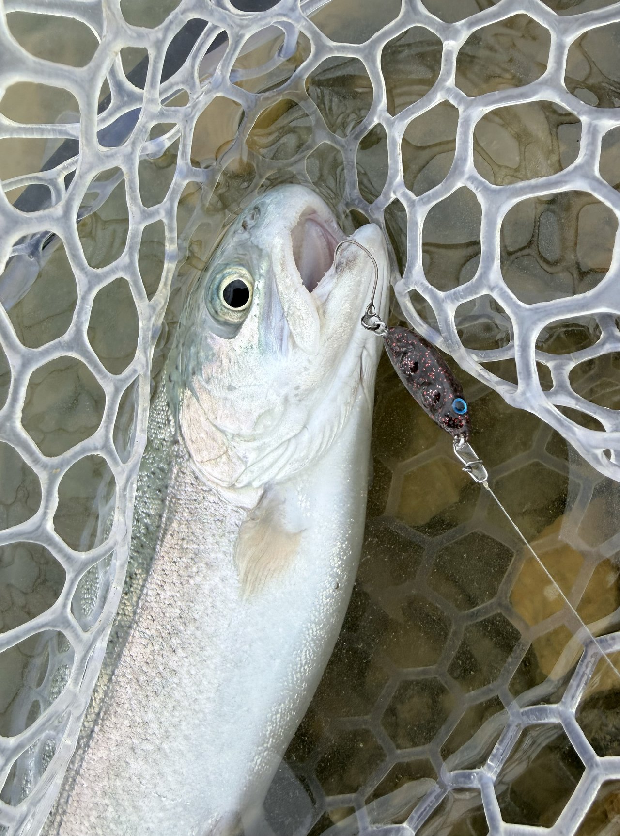 皆さんこんにちは。錦糸町店瀬尾です。栃木県佐野市は加賀フィッシングエリアに行って来ました。全国各地で春の嵐が吹き荒れる中、ここはなぜか穏やか。魚の活性も高くて楽しかったです。その割には釣果が芳しくないと。ちょっと巻きにこだわってしまいまして、正解はトップウォーターの釣りでした。私が巻いて来る間に小助川は2匹釣れちゃうぐらい魚が水面意識。ミスバイトやバラシも多くなりますが始終魚の反応があって楽しかったですよ。エリアトラウトもトップウォータープラグ忘れずに持って行ってくださいね。