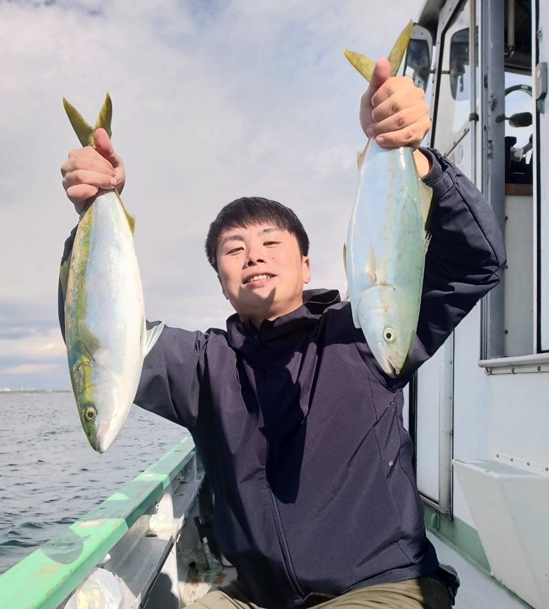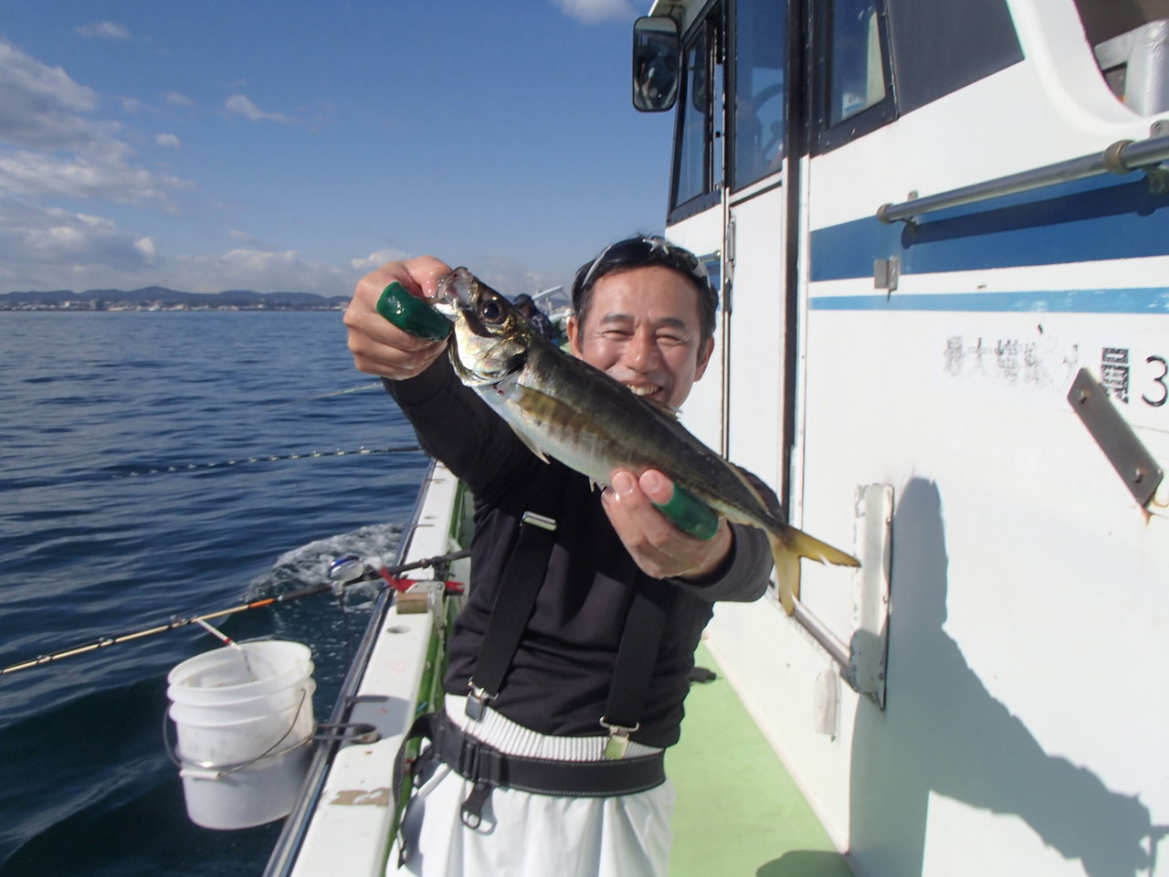 こんにちわ横浜市磯子店の佐藤です。走水のアジ釣りへ行ってきました。船宿はいつもお世話になっている関義丸さん6人での仕立てです。7時に出船し港前から始めますが、魚は居るのですがすぐに居なくなってしまい、移動を繰り返します。出船前港で釣ったカタボシイワシを泳がせると、すぐに暴れ竿を手に取って待ち構えましたが一瞬にしてハリスちぎられました。おそらくサワラではないかと思ってます。そしてポツポツ釣れるアジは皆型が良く泳がせるには勿体ないのですが、小さいのが釣れないのでその中でも小さ目な25cmを泳がせてました。10時ごろようやく泳がせの竿が暴れ竿が引き込むのを待って待って合わせを入れると、青物の凶暴な首振り!PE8号、ハリス12号なので強引に巻き上げます。そして無事にネットイン、5.5キロのワラサでした。その後残り時間1時間でようやくアジ釣れるようになりましたが30cmアベレージの大型ばかり、引きが強いのでハリスは切られ、意外とテクニカルで入れ食いとは行きません。でもその釣れなさが1匹の満足度が上がり、50匹釣った時よりも楽しかったです。最終的には13匹の釣果でしたが、十分楽しめました。真鯛も多く船中ではハリス切られる場面も多かったのですが上がったのは1匹のみ、アカタンが何故か食い良かった気がします。前日の冷たい雨、またしても水温低下にやられました。秋は仕方ないですね。