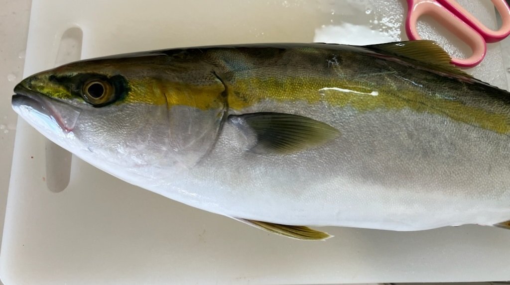 指示棚の上の方でアジを数匹針に掛けたら、下の方に落としてしばらく待つ…。すると「プルプル」程度だった魚の動きがいきなり「ドンドンドン!」に!手元に伝わるアタリが一気に強くなるこの瞬間、溜りませんね!!初挑戦で苦戦はしましたが、船長さんのポイント探しや常連様のアドバイスのおかげで何とか食べごろサイズのグッドなイナダを3匹釣り上げられました!他にはお土産タイムで水面を泳いでいたヒラソウダをサイトフィッシングでゲット!どちらも刺身で美味しくいただきました!