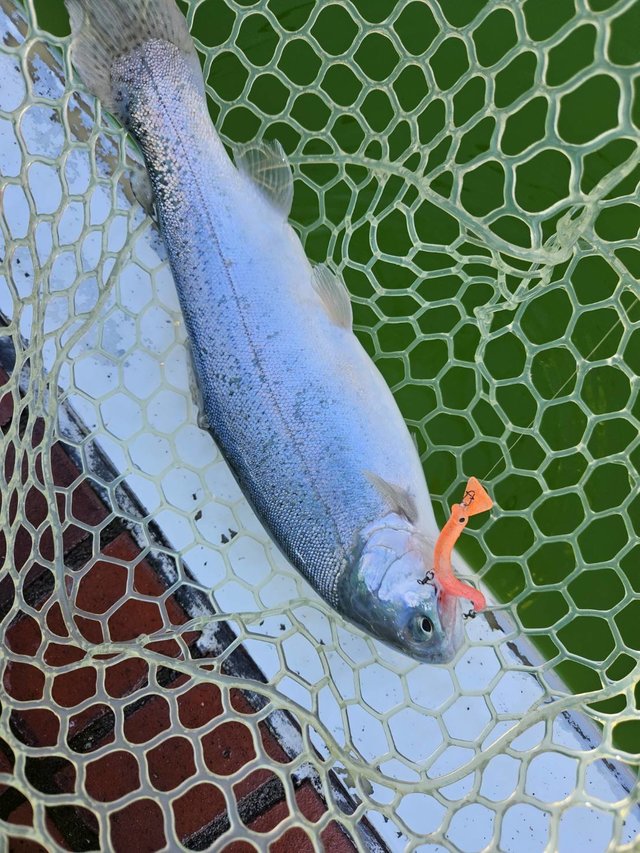 今回はジロー池の放流が狙い。キングサーモン×ニジマスの「富士の介」というイカつい魚です。