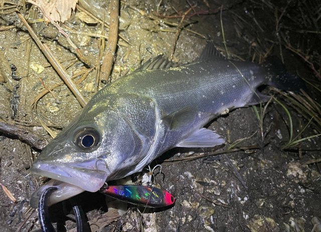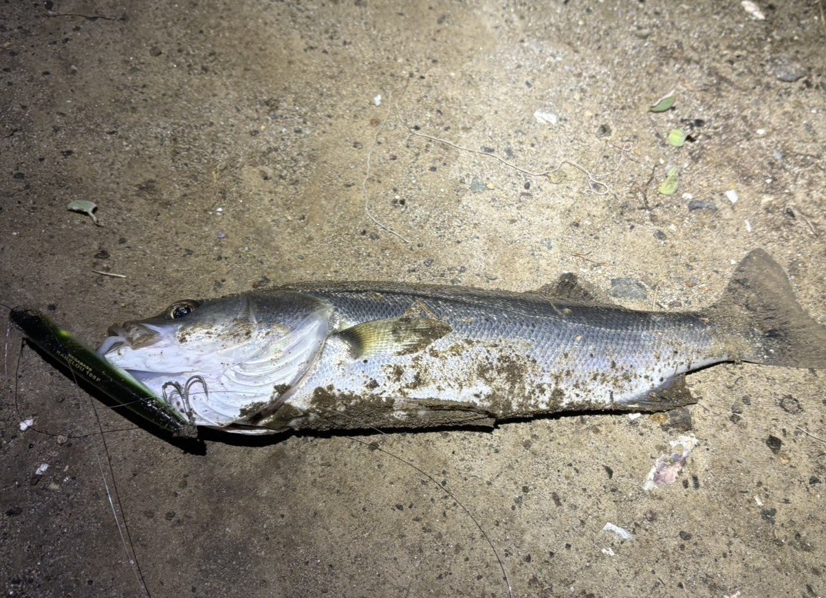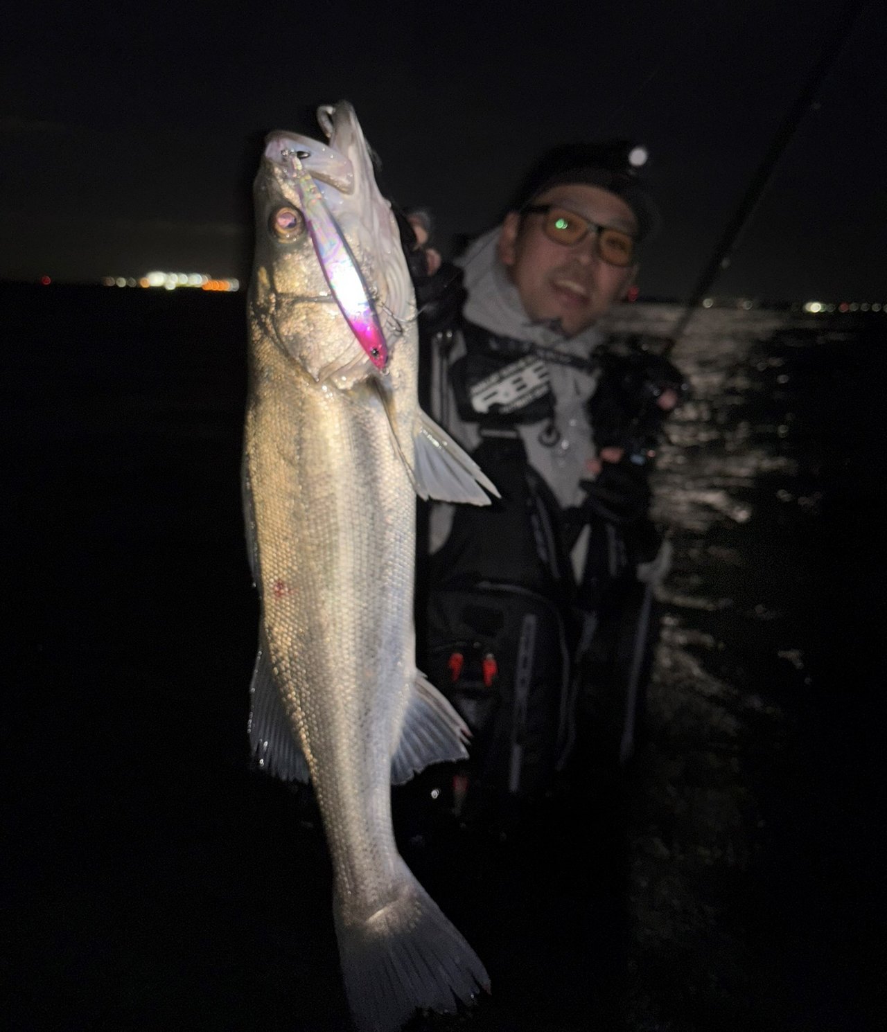 また爆風…。風裏のポイントに入り、キャストしながら下げの流れを効くのを待っていると「カゲロウ100F」や『ウィリップ87F』で可愛いサイズに遊んで貰い、21時前から一気に風が止んだタイミングからはシンペンが無双状態に流れの潮目を狙うと素直に反応してくれます(笑)しかしサイズは伸びず苦戦、最後に流れがぶつかり巻くポイントにLONGIN『レビンミニ』をキャストすると痛烈な引ったくりバイト!これは少しサイズがいい!!慎重にやり取りすると良いサイズのシーバスを無事キャッチし終了しました。まだ良いサイズが混ざるので、チャンスありますよ!