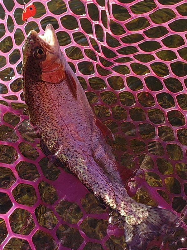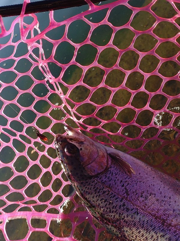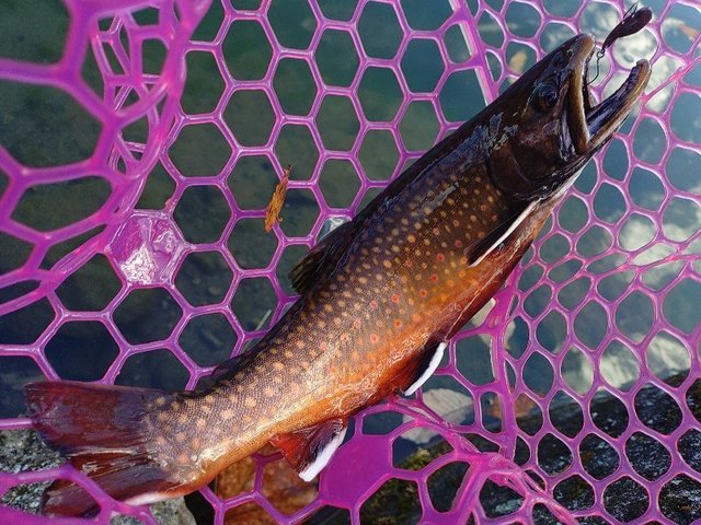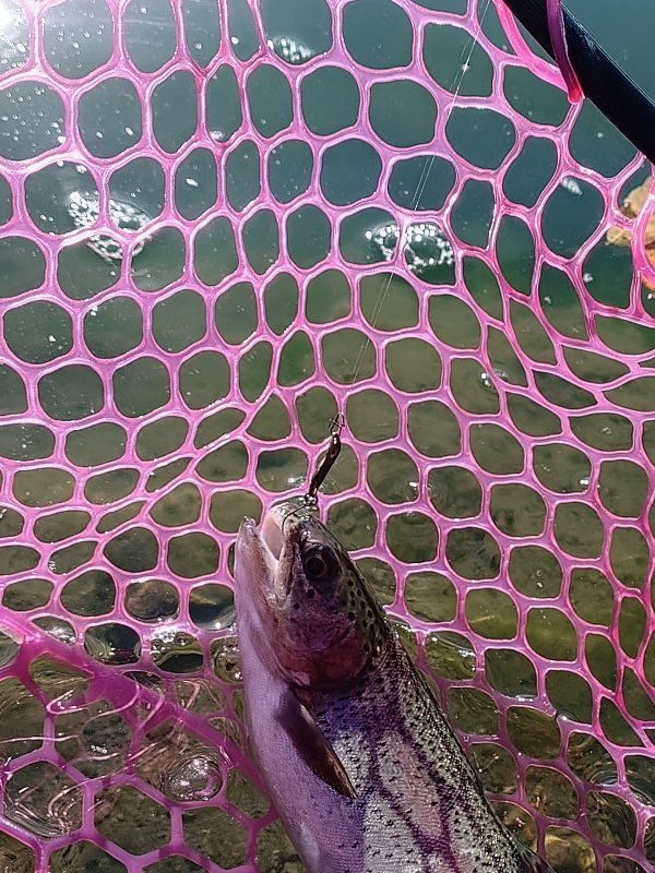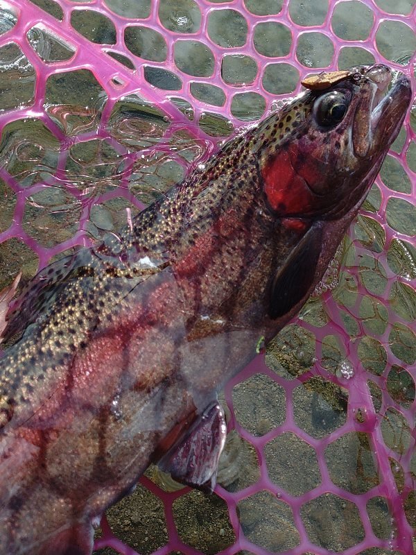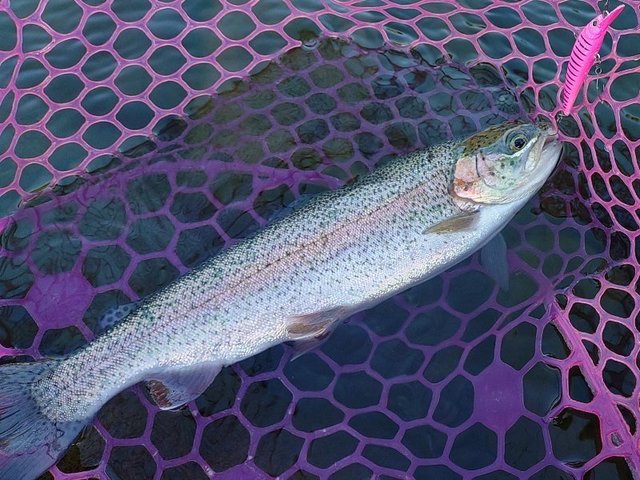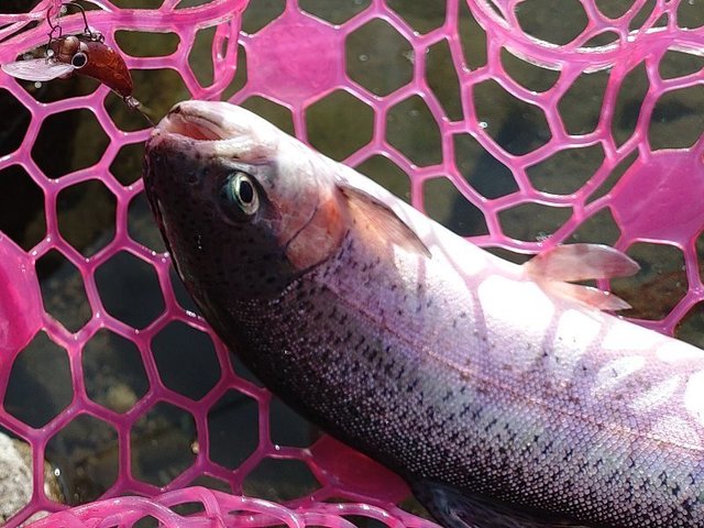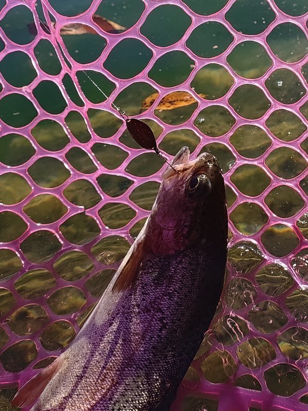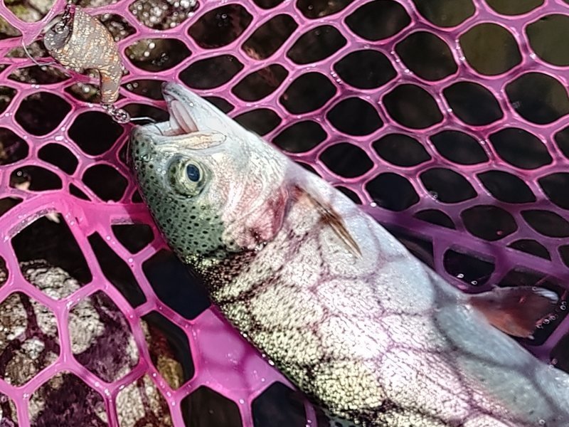 少ししてヒット!上がってきたのは…ニジマスでした(笑)