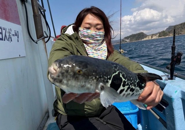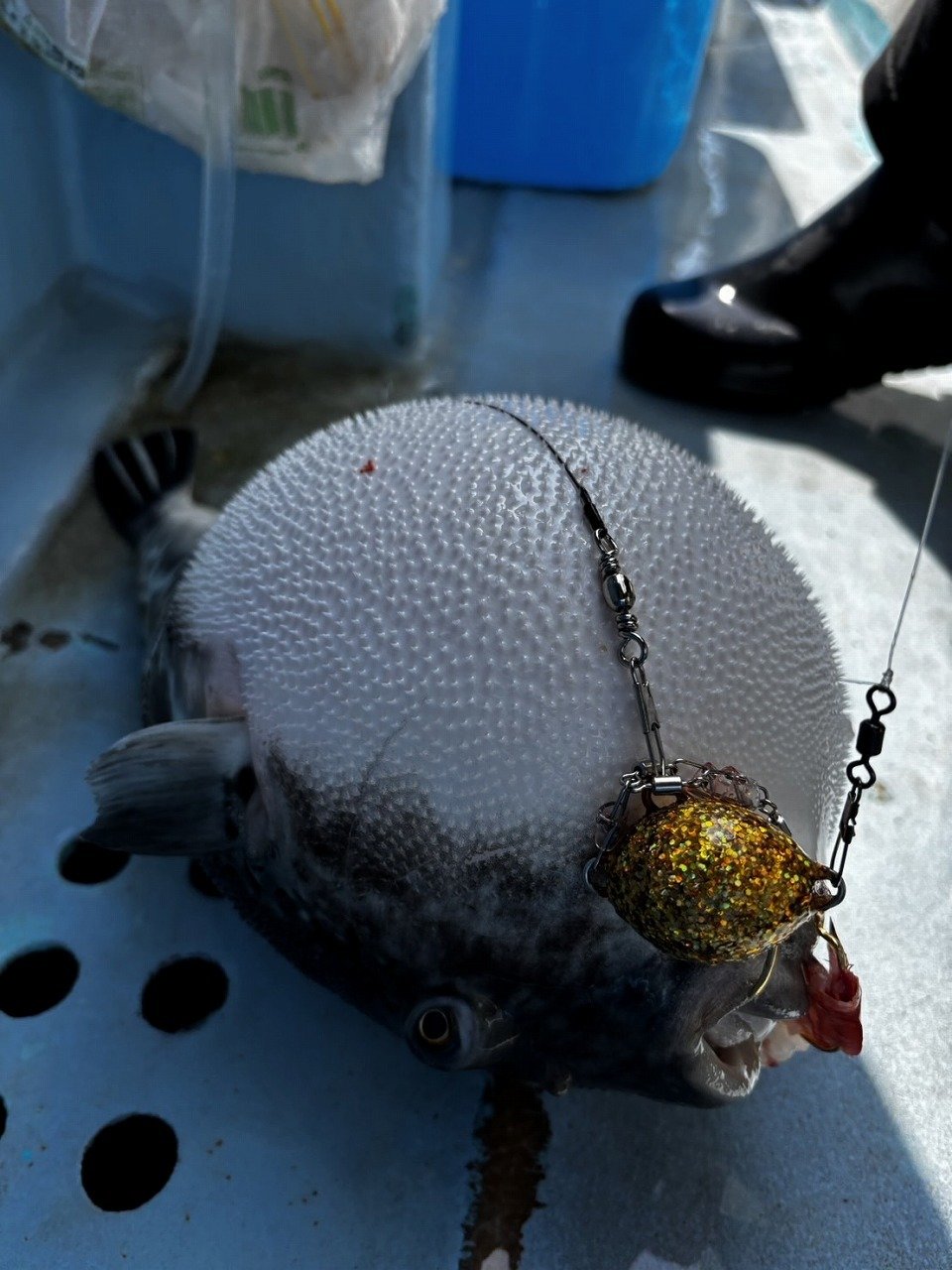 いま大盛り上がりの旬な釣り!トラフグ行ってまいりました♪今回はトラフグ初挑戦のお客様と一緒に新盛丸さんへ。オモリは40号指定で水深は60~80m。もたれる違和感を感じるものの合わせのタイミングうまくとれず悶絶。船長曰く最近はあたりはものすごーく小さく繊細なんだとか。アタリが分からないよ~!どんなアタリ?とお客様に尋ねられたので『もわもわもわもわ~ボッ!!です。ボッ!はフグがエサを吸引するアタリです。』となんとも抽象的な表現。ですが、その後すぐにお客様ボッ!のアタリをとらえて本命GET!!お見事です。船中たった3匹のうちの1匹。しかも白子入り!!またまたお客様が釣ってくださり嬉しい限りです。