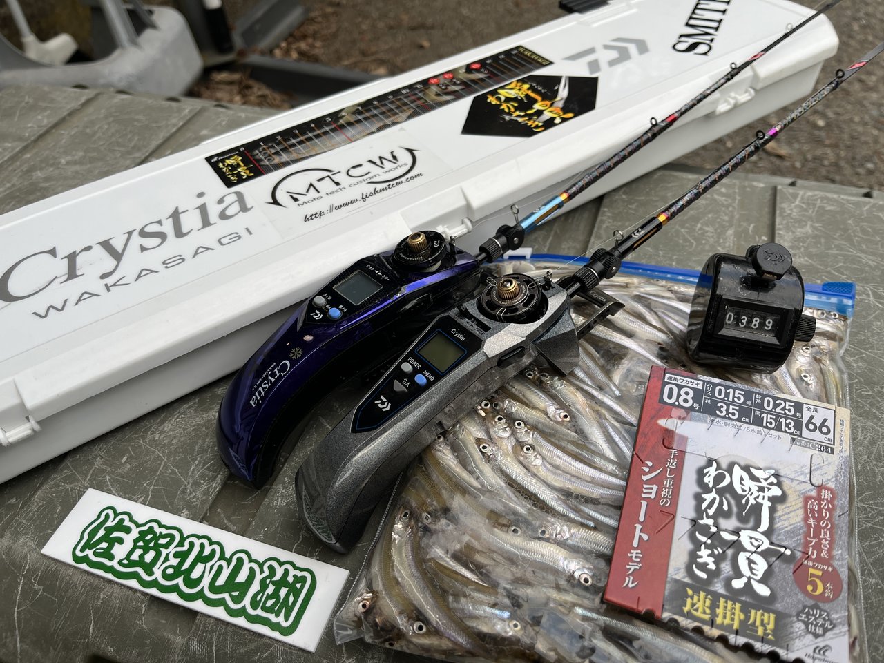 ハリス2cmのダイワ「クリスティア速攻夜光留1号/5本針」を右側にセット!左側は仕掛けをたるませて狙う「ふかせ釣り」や通常の「ミャク釣り」もこなせるオールマイティーなハヤブサ「瞬貫わかさぎ速掛型ショートモデル0.8号/5本針」をチョイスし実釣りスタート・・・しましたが氷点下の為ガイドが凍結し仕掛けが落ちない((+_+))10時頃からようやくまともに釣りが出来る様になりましたが11時までに50匹と大苦戦・・・そこで「本湖6番ワンド」の水深12mに移動しひたすら底ベッタリを回遊している個体を1匹また1匹と拾い釣りを展開し何とか389匹で初戦を終える事が出来ました。昨年12月からダムの水門を閉じている影響もあり湖流が無く「渋い」状況が続いていますがこの「渋さ」が本来のワカサギ釣りの醍醐味!ただ仕掛けを降ろしただけでは釣れない!①ボートを止める場所②仕掛けのチョイス③ワカサギの活性に合わせた誘い方など色々考えて掛けた価値ある1匹が面白い時期となっていますので腕を上げるチャンスですよ!防寒対策万全にトライしてみて下さい!(^^)!