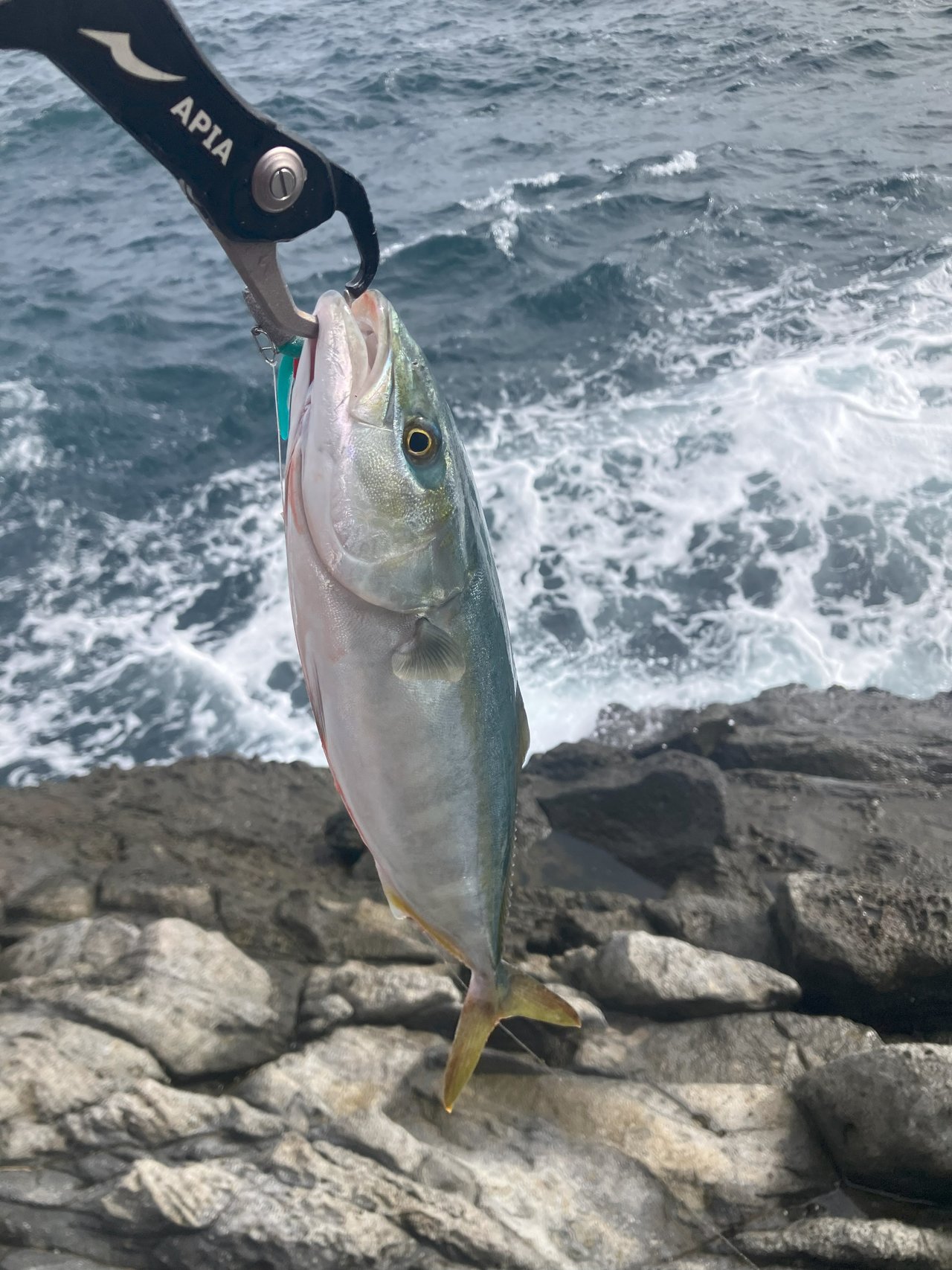 午後になって波が落ち着いたタイミングで磯にエントリーし、チビヒラを2匹ゲット。