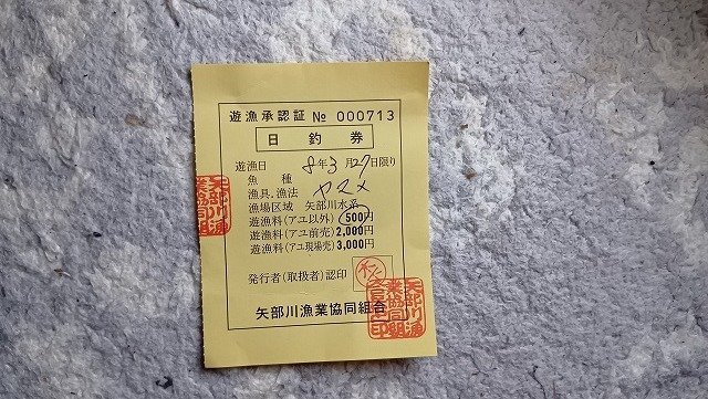 矢部川水系のヤマメ釣り日券は500円。