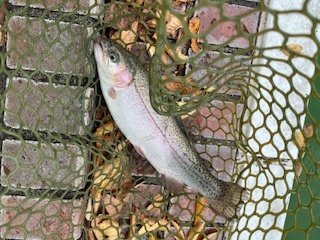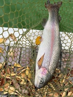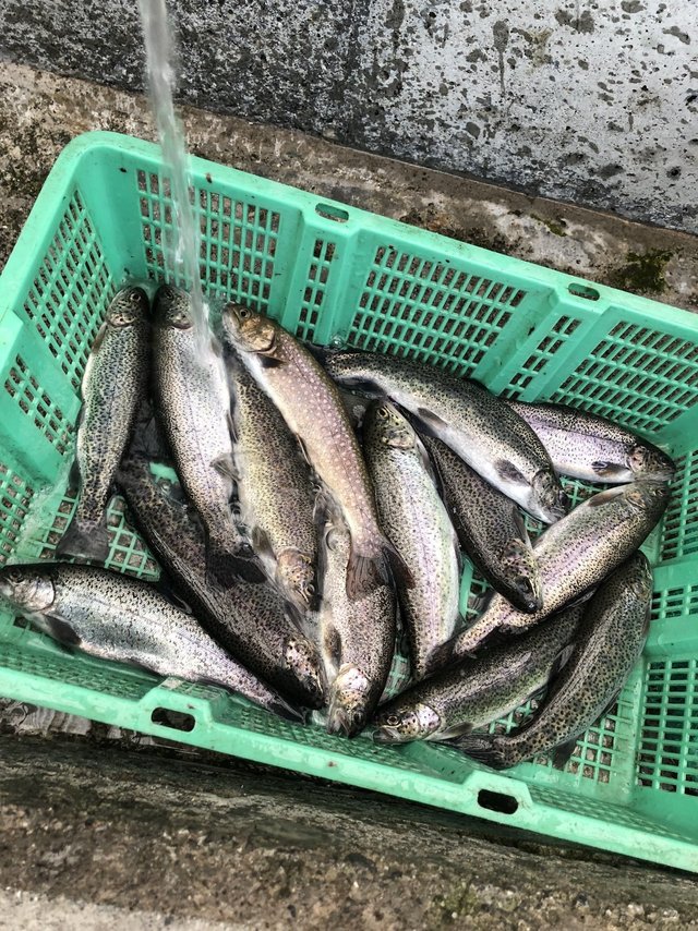 「今の時間からルアーは釣れないかもよ」との事でしたが挑戦しました。色や重さをローテーションさせた方が良いとの事、確かにスグに見切られ5投に1度スプーンを変えてみました、最初はバラしの連続で上手く掛けれずでしたが、食ったら早巻きで合わせてテンション緩めずを念じながら真面目に釣りしてニジマス14匹(イワナ1匹?)釣れました!