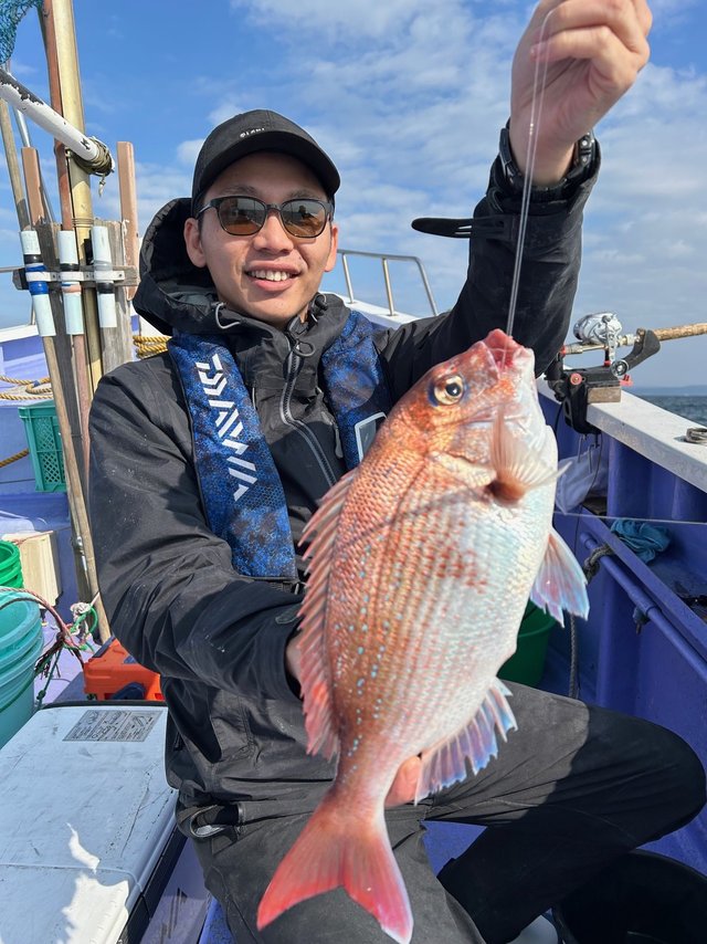 全くイメージがわきません(笑)アタリの出方もよくわからないので手返しよく、誘いを繰り返していると、、、。コマセを振ったときにグググっと重みが!先ほどのワラサとは違う引き、サバよりかは重たい引きに期待していると、、、ぽかんときれいなマダイが浮いてきました!