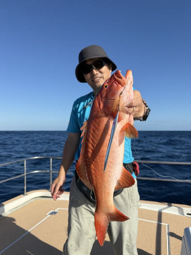 ダイワフィールドテスター仲村船長のキャプテンズOKINAWAさんに3日間お世話になりました。キャスティングをしやすいよう船長のこだわりが詰まった新艇が就航しました。広いフラットデッキと絶妙な高さの手すりが非常にやりやすく、最大5人まで投げられます(おススメは3~4人)。当日は11月なのに晴天で夏のような陽気。海の中もやっと水温が下がり始めたようだが、チェイスはあれど上にはあまり出たがらない様子で、それぞれフッキングまで至らないバイトやフッキングしてもすぐ外れ等で全員キャッチならずでした。また時々オキザワラ・バラクーダ・ダツ・シイラがちょっかい出してきました。2回ヒットして1回はすぐ外れルアーが歯で穴だらけにされ、もう1回はメガサイズ確信の渾身ファイトもメジロザメでした。BBQのおかず用アカジン狙いは、前回のデジャブのように今回も菜の花ジグで1投で仕留めました。アカジン狙いには菜の花ジグ必須です