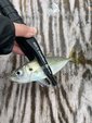 平日ではありましたが、多くのお客様でにぎわっていましたが気温が低く風も冷たかったこともあり活性はイマイチ・・・・。僕は最初クレイジーシリーズのハードベイトをメインで投げたのですがなかなかヒットせず苦戦をしました。午前券だったのでどうしても魚を釣りたくて最終兵器の一誠の沈み蟲を投入!!ボトム付近をゆっくりズル引きしているとラインが走ったのですかさずフッキング!!バーブレスフックなので慎重にやり取りして釣れたのは35cm位のバスでした。